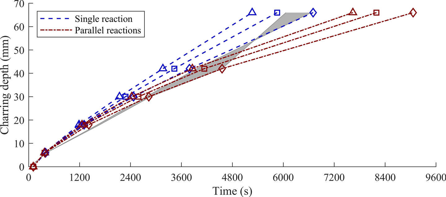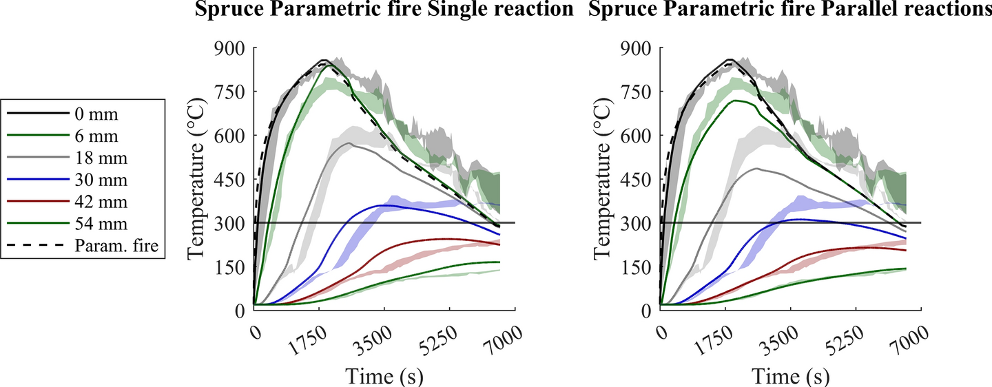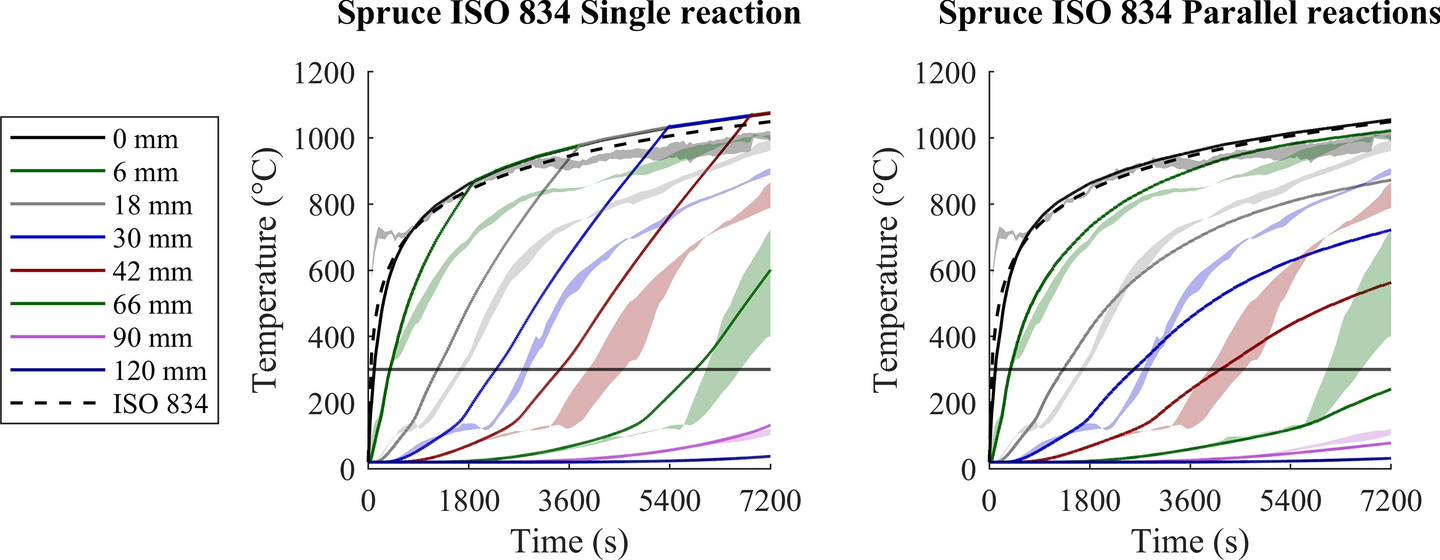 We point out that even in its current state, the models for spruce are able to capture the progress of the 300°C isotherm inside a large scale specimen, however minding that the char front progress starts significantly delaying at greater depths with the parallel reactions model, as the simulated temperature at 66 mm depth in Figure 17 shows. Table 7 shows neither the single-, or parallel reactions models appearing superior to one another in prediction of char front progress, the single reaction model producing a poorer fit than the parallel reactions model to the parametric fire test, but a better to the ISO 834 test.