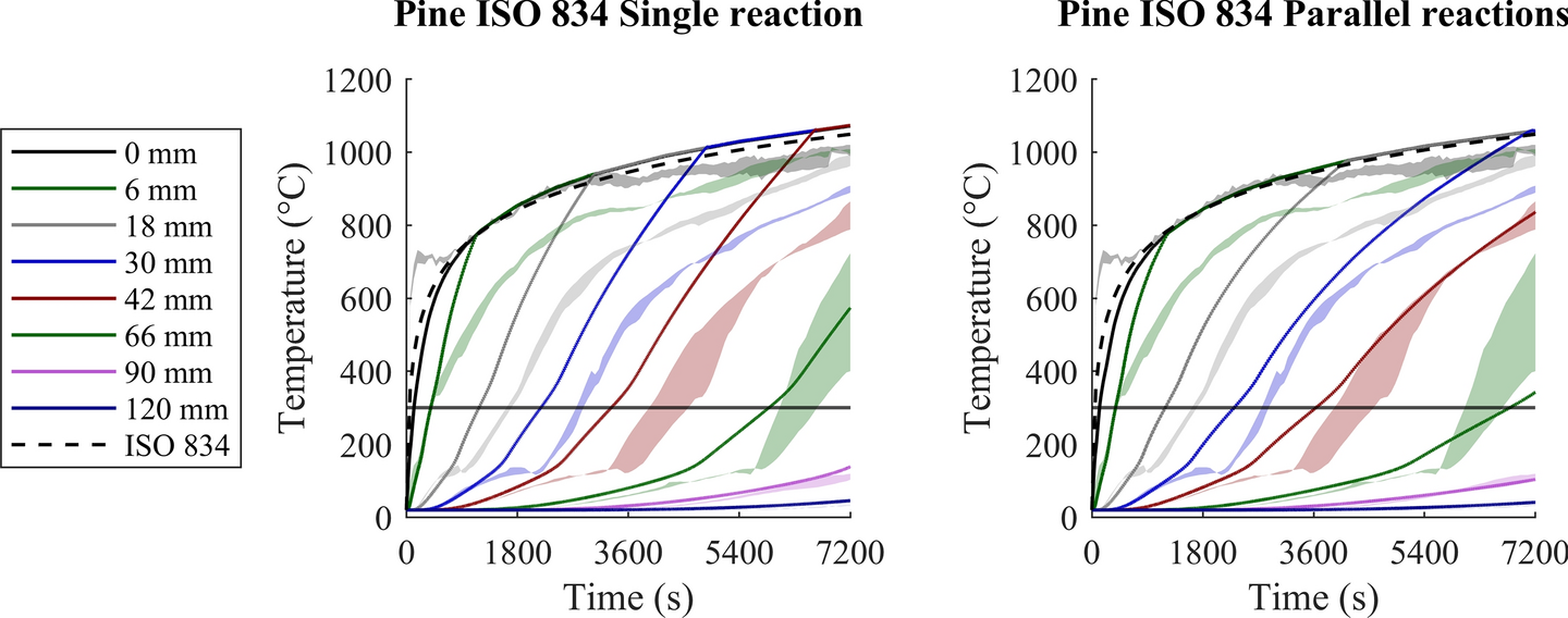 It is difficult to conclude, whether the single-, or parallel reactions model would be an optimal choice in predicting temperature profile in large timber assemblies under fire. Simulations of the experiments of König and Walleij [52] show little difference in temperature profile evolution between the single-, and parallel reactions models. On the other hand, the question of preferable model becomes highly ambiguous when comparing the simulations to the ISO 834 fire tests [53], as the predicted final temperatures are significantly off the experimental values with both models, but in opposite directions. Applying the pine single-, and parallel reactions models for the ISO 834 test, the simulation results turned out to differ significantly from the experiment, and we conclude that none of the models for pine are neither able to predict satisfactorily the internal temperature development in large scale.