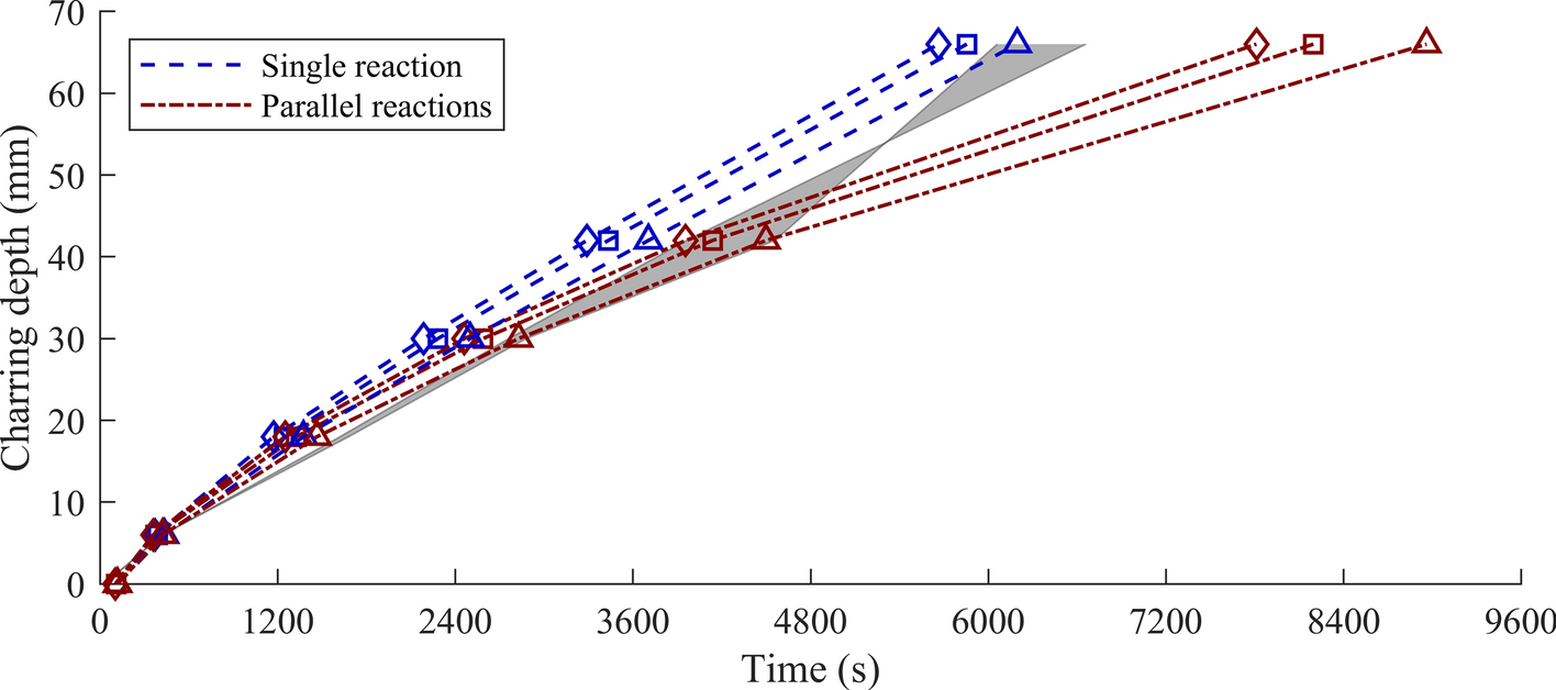 Sensitivity analysis of moisture concentration on char front progress. Experimental variation in shaded area [53], and simulations of spruce with moisture contents of 5, 8 (reference) and 15 wt% with diamond-, square-, and triangle-shaped markers, respectively