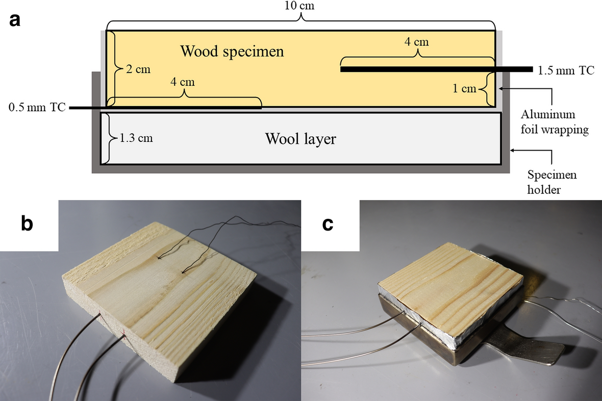 Spruce and pine specimens of 2 cm in thickness and 10 by 10 cm in exposed cross section were tested in horizontal operation under near oxygen-free atmosphere, and in smoldering and flaming conditions, the latter two being under ambient atmosphere. Each experiment is replicated three times, and any representation of a cone calorimeter test in this paper is the experimental average or their variation. At all tests, specimen was wrapped in aluminum foil on all nonexposed sides and placed on a 1.3 cm layer of ceramic wool, the direction of heat flux being in perpendicular to the grain. During the near oxygen-free operation the sealed testing compartment was flushed with a nitrogen flow of 4 l/s, while the cone calorimeter exhaust fan was set at 8 l/s, the difference being made up of surrounding air entering between the bottom of the exhaust hood and the top of the testing compartment. The smoldering conditions were established by means of absence of pilot ignition spark and using sufficiently low heat flux levels to avoid autoignition. Pyrolysis experiments were carried out under heat flux levels of 35 and 50 kW/m2 for both woods, smoldering experiments under 25 and 35 kW/m2 for spruce and 20 and 30 kW/m2 for pine, as it was found out to self-ignite at 35 kW/m2. Flaming experiments were carried out at 25, 35 and 50 kW/m2 for both woods. Pyrolysis and flaming experiments under 35 kW/m2 were replicated with installed thermocouples at halfway inside the specimen (1 cm depth) and at its unexposed surface (2 cm depth), two sensors for each depth. This had to be done separately from the experiments measuring mass loss, as thermocouple wires caused tension to the sample. Looking from above, the temperature measurement points were positioned at the corners of a 2 cm square, centered on the middle of the specimen. All thermocouples were of K-type (estimated uncertainty of ± 2.5°C in ambient, ± 5.3°C in the highest measured temperatures of approximately 700°C). Those installed inside the specimen were inserted horizontally in perpendicular to the heat flow and were 1.5 mm in diameter, tightly fitting into the drilled hole, and those on the unexposed surface were 0.5 mm in diameter, positioned between the wood specimen and the foil wrapping. Figure 1 presents a side view of thermocouple positioning and photographs of an instrumented specimen, showing the thermocouple positioning on the unexposed side, and the assembled specimen inside the holder. In the finished specimen assembly, thermocouples would be punctured through the foil wrapping, and the specimen was laid carefully on the ceramic wool layer, so that the thermocouples in between would stay stationary. We acknowledge the uncertainty in the thermocouple position at 1 cm depth, associated with drilling a long horizontal hole for the thermocouple. Our first approach was to drill a tight-fitting hole for 0.5 mm thermocouple from the unexposed side to 1 cm depth. However, these results proved unacceptable, as the thermocouple wire was conducting an excessive amount of heat away from the measuring point, even though it was the narrowest that could be practically used for the purpose.