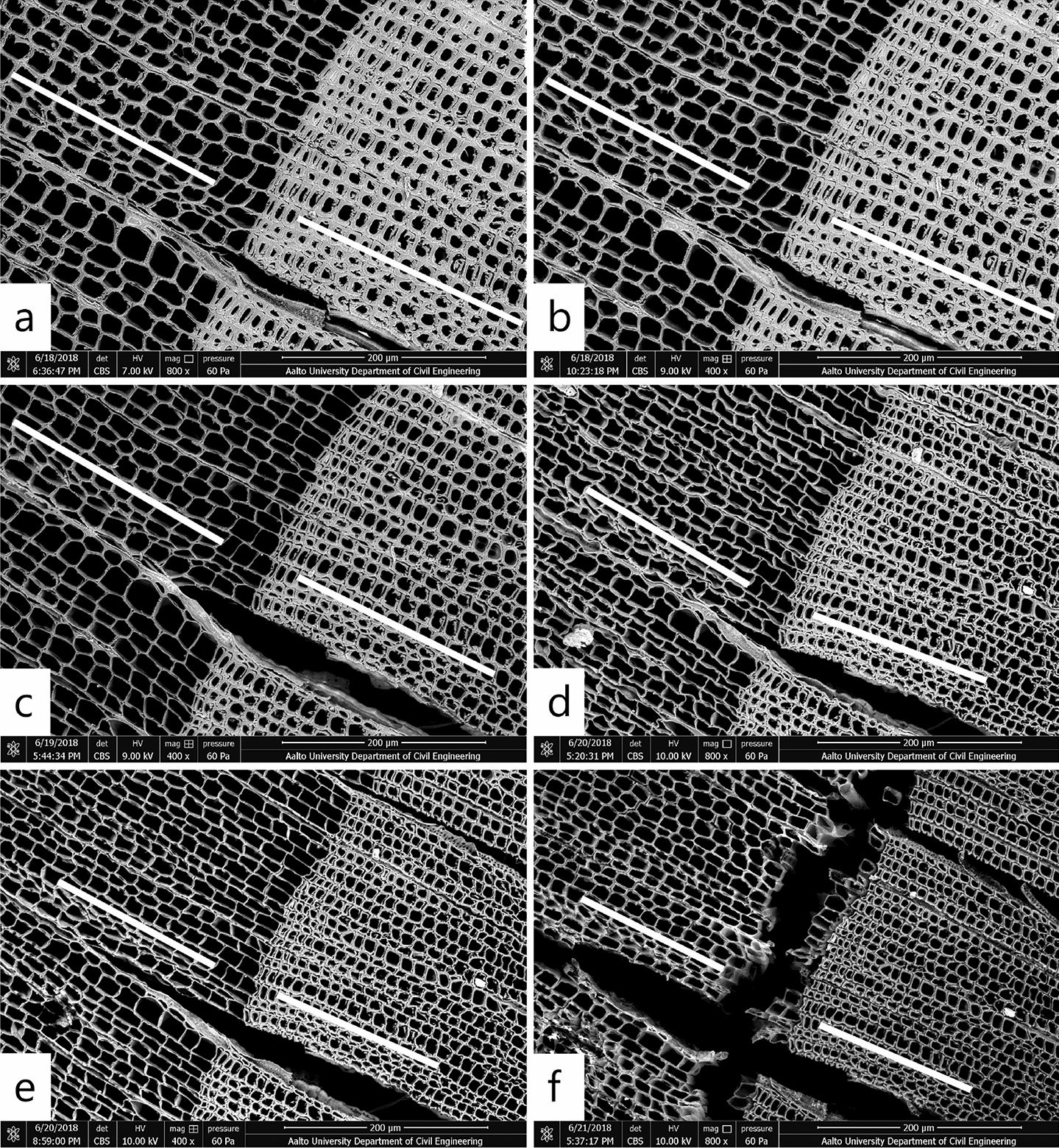 Scanning electron microscope images taken on the same location on a spruce wood specimen after pyrolysis in different temperatures. The images are (a) reference without thermal treatment, after pyrolysis at (b) 250°C, (c) 325°C, (d) 400°C, (e) 475°C and (f) 550°C. The scale bar is 200 µm in all images