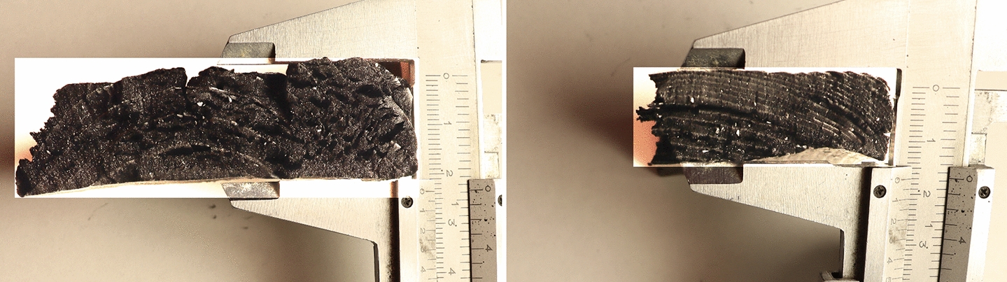 Charred specimens of spruce (left) and pine (right) after cone calorimeter testing in nitrogen, opened. The grain direction is towards the reader. The image brightness is adjusted in the specimen region to better reveal the char structure