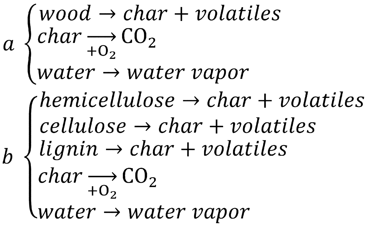 Figure 2 shows the reaction schemes employed in this work (single and parallel reactions, a and b, respectively). Our initial study revealed that an oxidation reaction for virgin wood does not improve the quality of the model, so char oxidation was maintained as the only oxygen-dependent reaction. Moisture evaporation (bound water to water vapor) is considered as its own reaction.