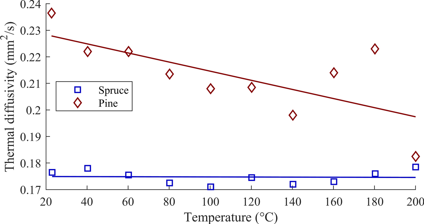 The thermal diffusivities of spruce and pine woods were measured with the laser flash analysis (LFA) method. The measurements were conducted with Netzsch LFA 427 apparatus equipped with an S-type sample thermocouple (estimated uncertainty of ± 1°C) and an InSb IR detector. The measurements were performed in a nitrogen atmosphere (50 mL/min flowrate, 99.999 vol% pure). The laser voltage applied was 650 V with 0.5 ms pulse width. For the measurements the wood samples were machined into a shape of a flat cylinder 12.4 mm to 12.7 mm in diameter and 2.90 mm to 4.25 mm thick. The samples were prepared in such a way that the thermal diffusivity was measured in the direction perpendicular to the grain. Both sides of the samples were coated with a graphite spray prior to the measurements. Three identical measurements were performed at each temperature within the range of 20°C to 200°C with 20°C steps. The generated raw data were post processed with the Standard model by Netzsch, which is an improved Cape and Lehman model [34].