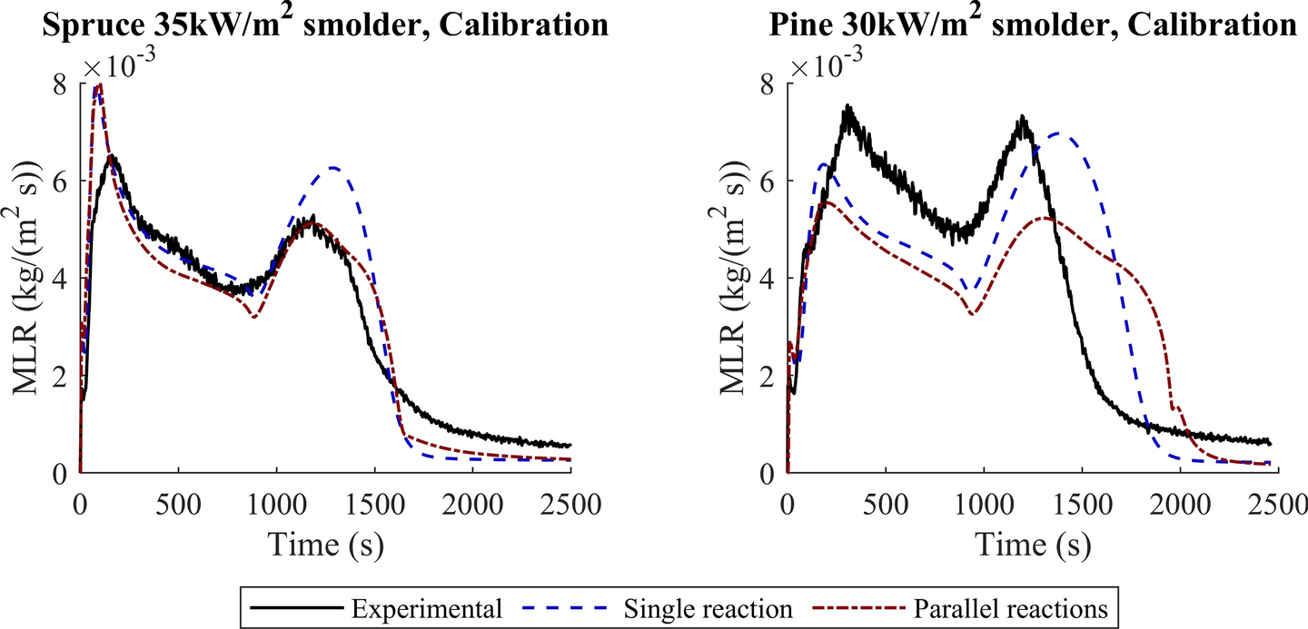 Our initial strategy for model estimation was as follows: firstly, to estimate kinetic parameters for water evaporation, heats of pyrolysis and char emissivity from oxygen-free cone calorimeter tests under 35 kW/m2, assuming wood pyrolysis kinetics determined in [32]; then maintaining the previously estimated parameters, to estimate char oxidation kinetic parameters from smoldering cone calorimeter experiments under 35 or 30 kW/m2 (spruce and pine, respectively); finally using the other tests under different heat fluxes and those in flaming conditions as model validation. The water evaporation kinetics were estimated using current results from cone calorimeter experiments, because our preliminary simulations revealed, that those estimated to thermogravimetric results in [32] were not able to reproduce the experimental temperature development inside the specimen. This strategy worked out well for the single reaction spruce model, but for the parallel reactions spruce model and both of the pine models, the model fit to flaming experiments was unacceptable. Therefore, the parallel reactions model for spruce, and the single-, and parallel reactions models for pine were estimated using the experimental data in oxygen-free, smoldering and flaming conditions simultaneously as the target data. Experimental data under 35 kW/ m2 was used for all different experimental conditions in the new estimation strategy as well, by exception of using experiment under 30 kW/m2 for smoldering pine. After estimating the single reaction spruce model according to our initial strategy, to minimize the amount of estimated parameters, we assume the same water evaporation kinetic parameters and char emissivity to hold for all other models as well. Table 2 presents the estimated model parameters.