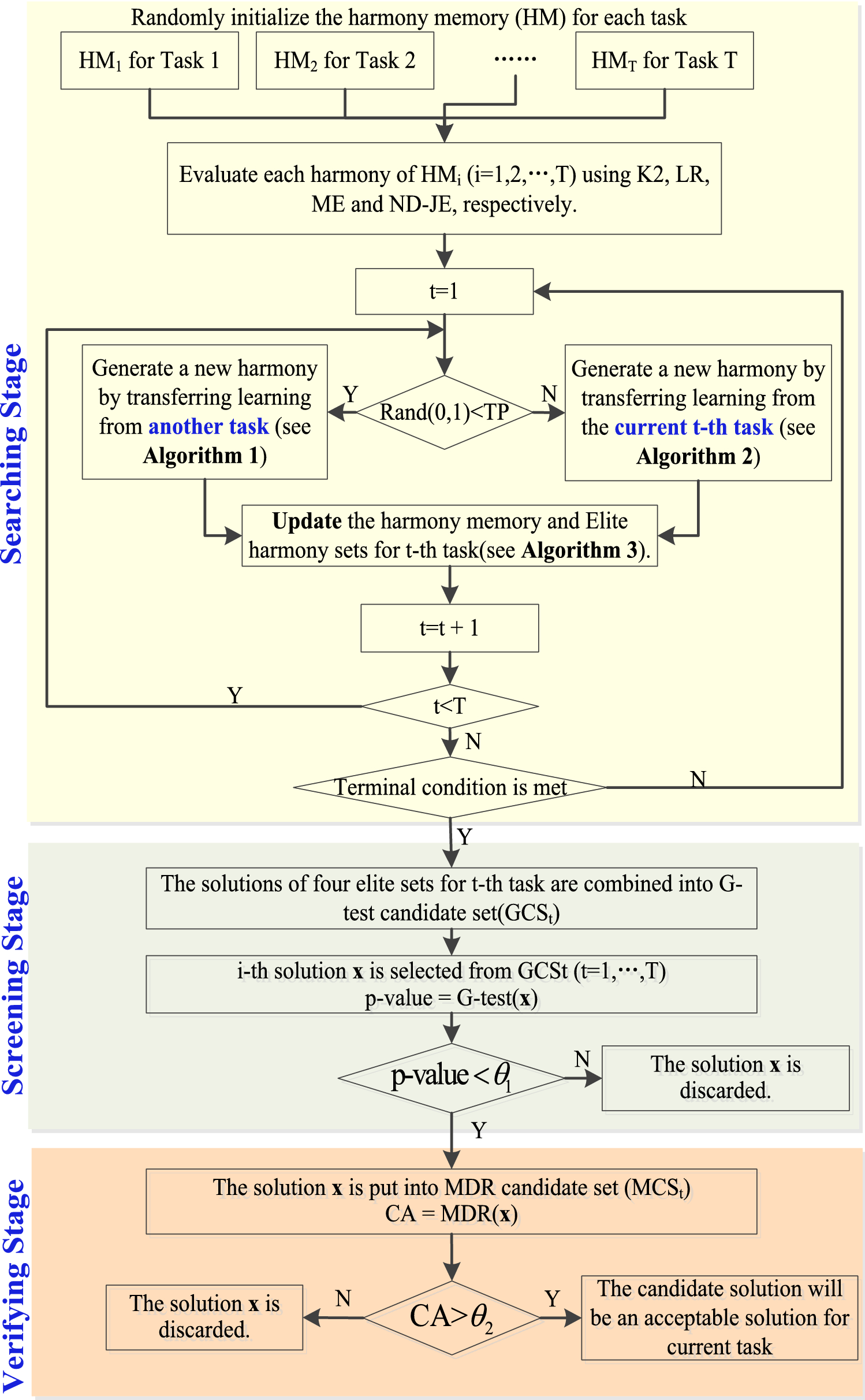 MTHSA-DHEI is divided into three stages: the search stage, screening stage and verification stage. In the search stage, a multitasking HS is adopted to find potential SNP combinations that have a strong association with disease status. The G-test [30, 32, 59] statistical method is employed to test the significance level of the difference between control samples and case samples in the screening stage, and the SNP combinations with significance level p values larger than the threshold value \({\theta }_{1}\) are discarded. In the verification stage, MDR [38] is further used to verify the classification ability.