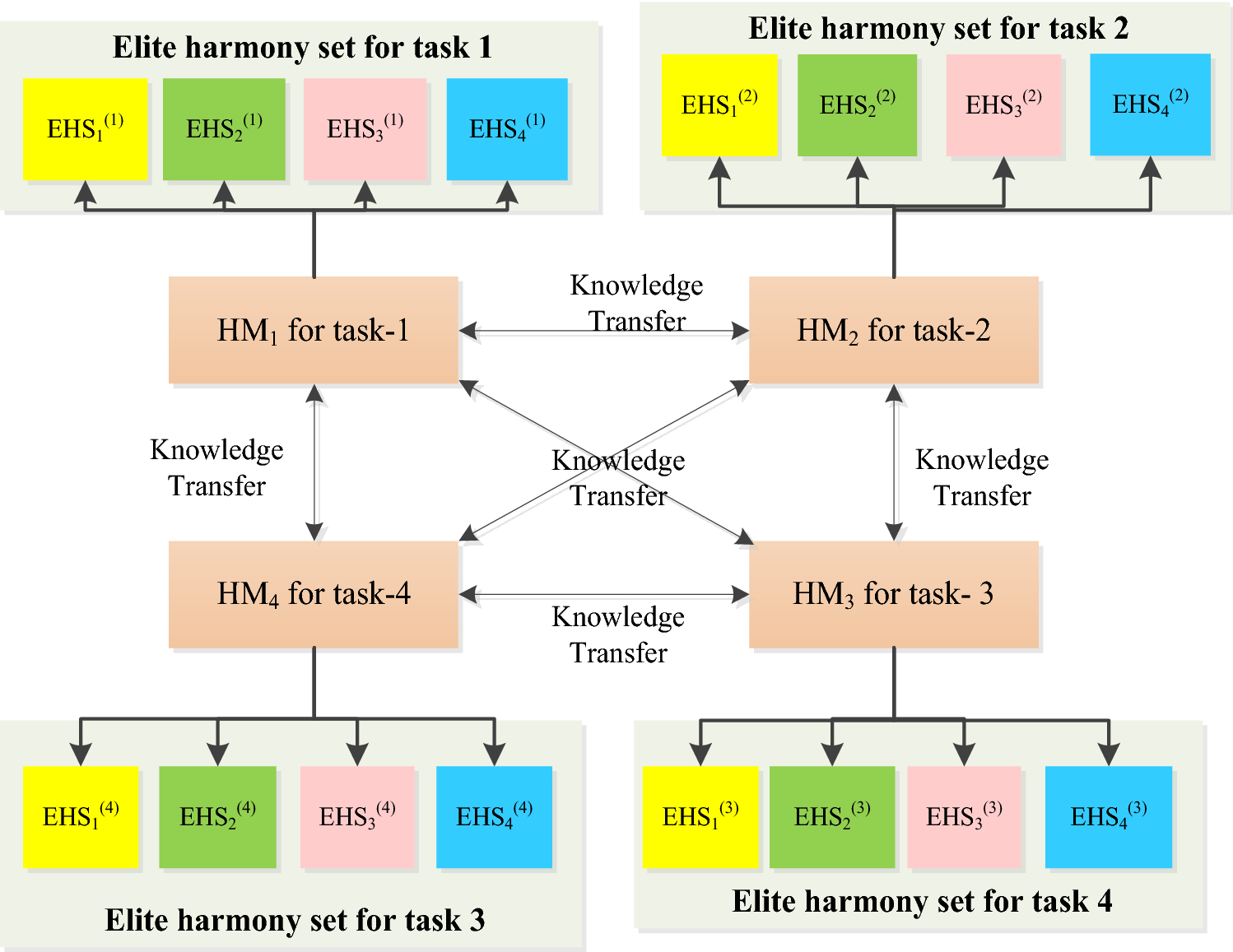 In the proposed MTHSA-DHEI approach, improvising a new harmony for the current t-th task has two steps: (1) knowledge transfer from other tasks and (2) generation of a new solution in the current task by using HMt, EHS1t, EHS2t, EHS3t and EHS4t. Figure S1 shows an example in which task 2 transfers knowledge to task 1 (see Supplementary file 1).
