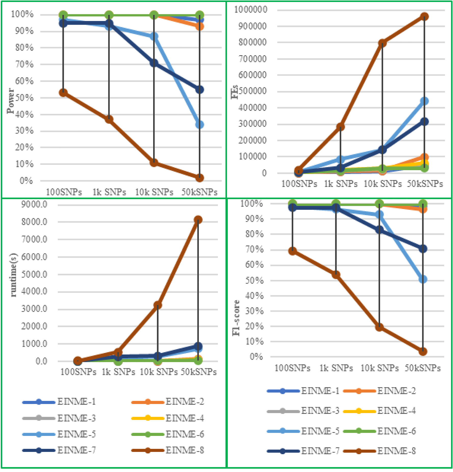 (3) Runtime denotes the mean runtime that an algorithm takes to detect the kth-order SNP epistatic interaction before the algorithm is terminated, and it is intended to measure the time cost of detecting high-order SNP epistatic interactions.