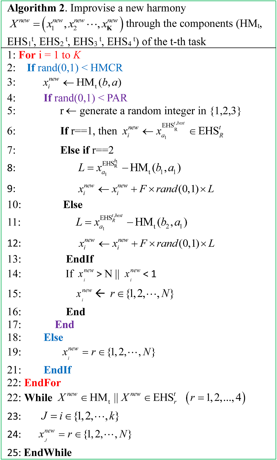 In Fig. 1, the general flow of the search stage is presented, in which Algorithm 1 and Algorithm 2 introduce the improvisation of new harmonies based on knowledge transfer from other tasks and the current task, respectively. Algorithm 3 presents the process of updating the harmony memory and elite harmony sets (EHS1t, EHS2t, EHS3t and EHS4t) of the t-task.