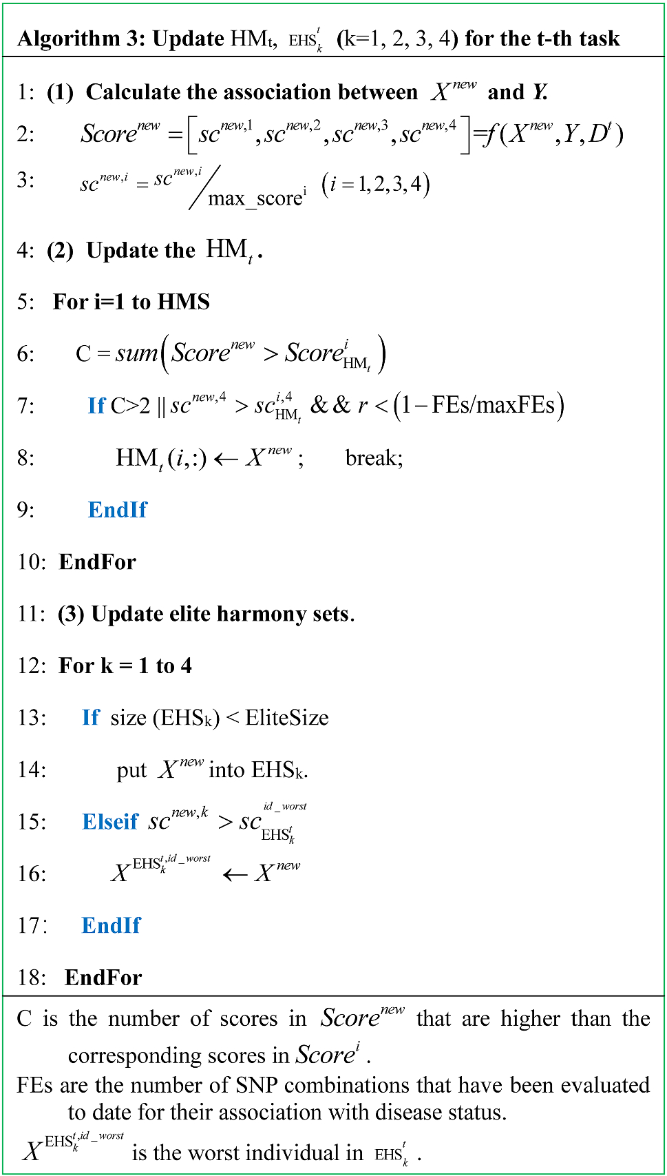 Four tasks are separately employed to detect 2nd-order, 3rd-order, 4th-order and 5th-order SNP interactions simultaneously. The t-th task possesses an HM (HMt) for recoding the potential SNP combinations and has four elite harmony sets (EHS1t, EHS2t, EHS3t and EHS4t) for storing the elite solutions. In EHS1t, the association of SNP combinations is calculated with the K2 score based on a Bayesian network. The association of SNP combinations is calculated with the LR in EHS2t. In EHS3t and EHS4t, the association of SNP combinations is separately calculated based on the ME and ND-JE scores. The tasks exchange information with each other to improve the search capability and speed