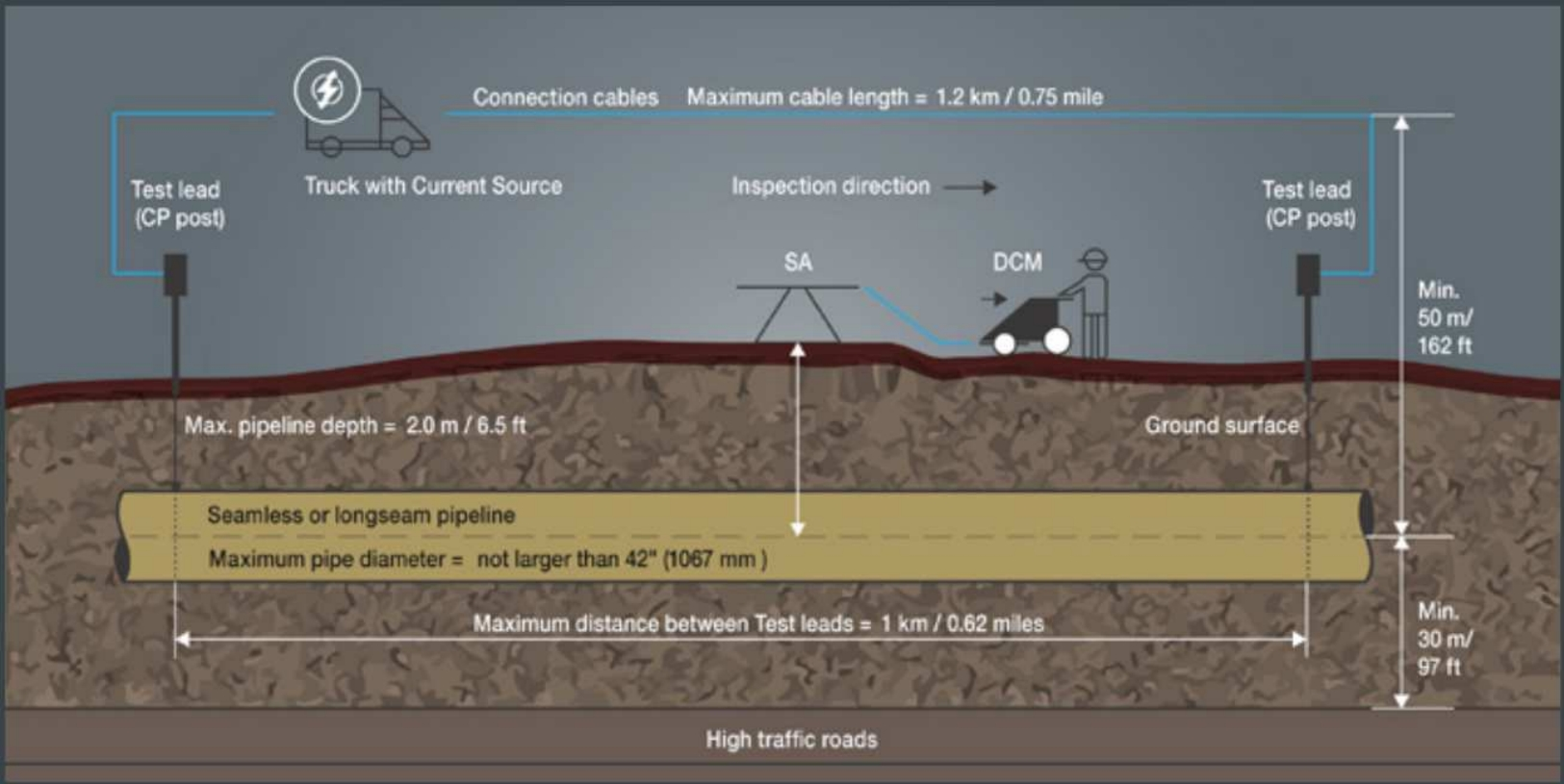 By measuring and comparing the magnetic field outside the pipe at different frequencies, it is possible to differentiate between “metal loss” and “no metal loss” scenarios. This principle underpins the above-ground electromagnetic inspection method.