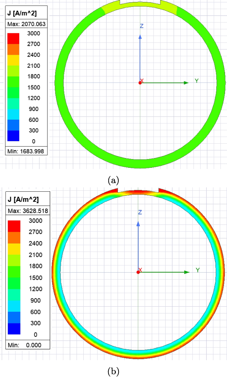 Current density in the cross section of a defected pipe with an outer diameter of 10 inches and a thickness of 0.5 inches generated by a 16 A current applied at the extremities. (a) 1 Hz (b) 1000 Hz