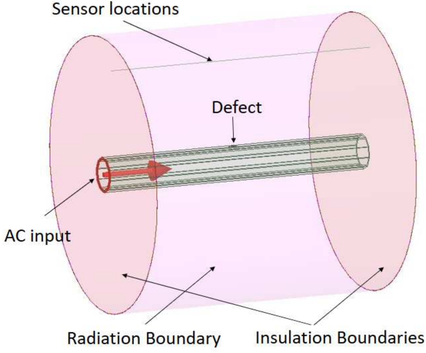 Finite Element Analysis (FEA) was conducted using ANSYS Electronics Desktop to simulate the electromagnetic field induced by frequency-dependent AC currents in the pipeline. The pipeline was modeled as an isotropic uniform carbon steel pipe with a square-shaped metal loss defect with constant depth. The multi-physics simulation software solved the electromagnetic field partial differential equations (PDEs) described by Maxwell’s equations, employing a fine mesh near the defect. Various scenarios, including different defect locations, AC frequencies, and sensor position, were considered in the FE modeling.