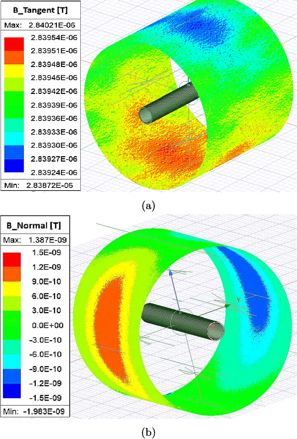 For this specific case, the tangential and the normal components of the induced magnetic flux were obtained from both the numerical simulation and the analytical formula of an infinite intact pipe: