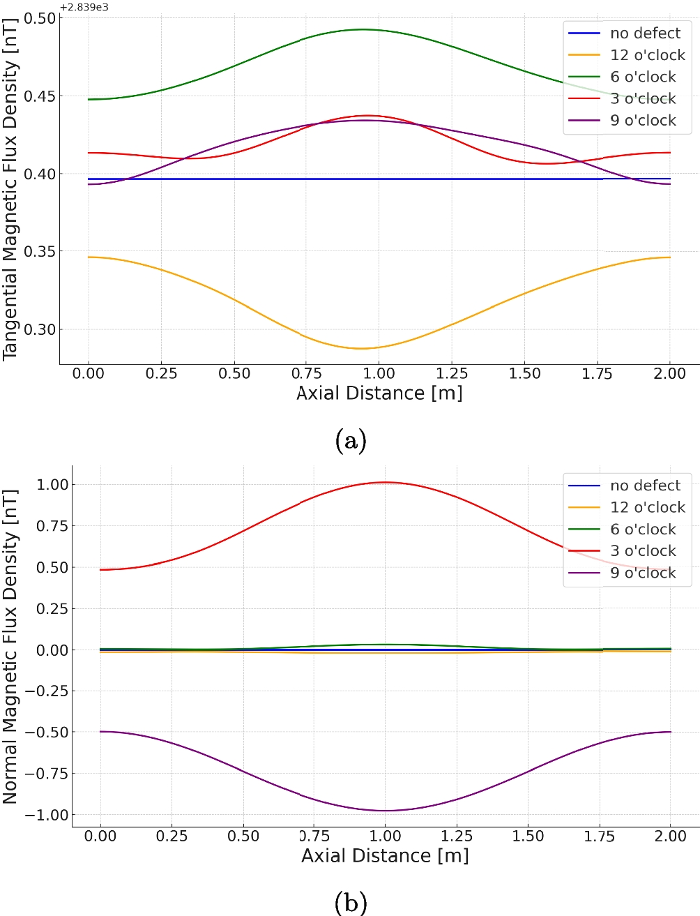 Notably, the tangential component showed more pronounced perturbations when a defect was located at the pipe’s 12 o’clock or 6 o’clock positions. This suggested higher sensitivity of the tangential component in detecting defects aligned with the pipe’s longitudinal axis. In contrast, the perturbations in the normal component of the magnetic field were more distinct when a defect was situated at the 3 o’clock or 9 o’clock positions of the pipe. This indicated that the normal component would be more effective in identifying defects placed to the pipe’s sides. It should be emphasized that the electromagnetic field distortion is at the nanotesla level, with the provided AC current and the distance for sensory. Hence, sensors with such high signal detection capability are required.