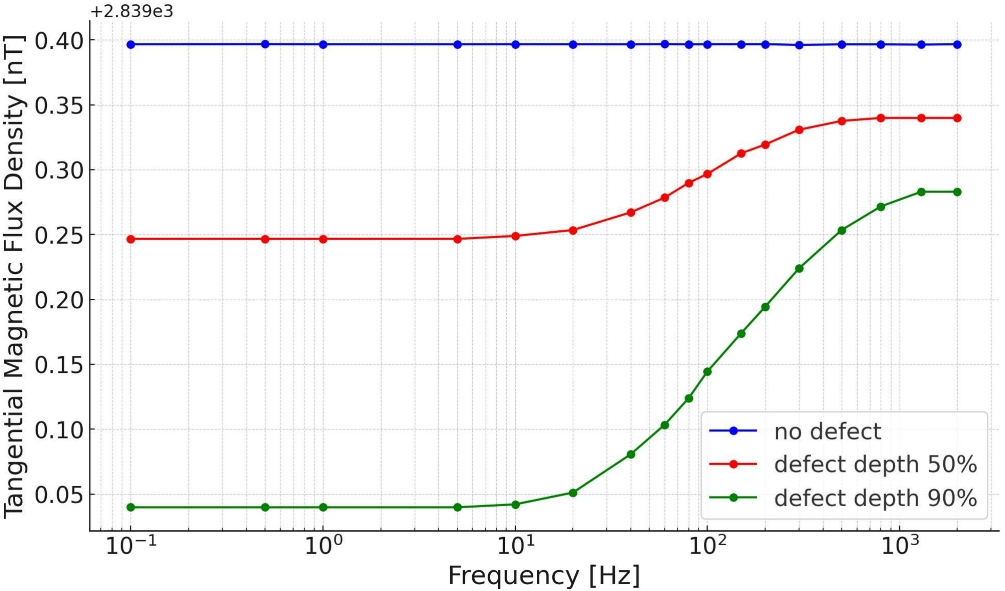 Our simulations showed that at low frequencies, the magnetic field perturbation caused by the defect is more significant, but as the frequency increases, the value of the magnetic field gets closer to the values of the magnetic field induced by an intact pipe. Figure 7 shows the magnetic field variation for multiple frequencies measured at 1 meter above a pipe. The defect in this case is placed at the 12 o’clock position, but the same trend is observed for all defect orientations.