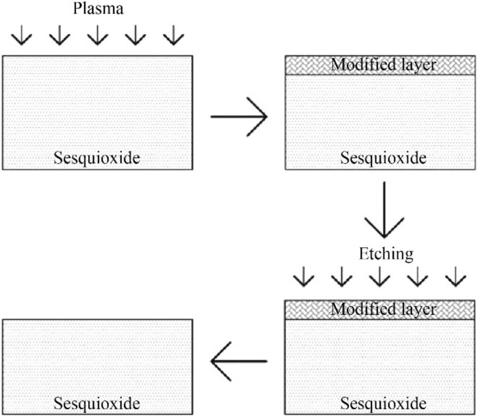 In the process under development, irradiation of reactive plasma was employed to modify the surfaces of a chemical inert material to form a more active layer. Subsequently, acid etching was used to preferentially remove the active layer. Figure 1 shows a schematic of PaE process. After hydrogen with a flow rate of 30 standard-state cubic centimeters per minute (cm3/min) was supplied to the Diener plasma generator, some hydrogen was excited, becoming reactive radicals at radio frequency (RF) (f = 13.56 MHz). The reactive radicals caused chemical reactions with the surface atoms. As a result, hydrogen ions were introduced into the sesquioxide, transforming it into hydroxide. Additionally, hydroxide is more likely to react with acids than sesquioxide. After plasma modification, inorganic acid was used to remove the modified layer to obtain an ultrasmooth surface without surface/subsurface damage. The experimental parameters are listed in Table 1.
