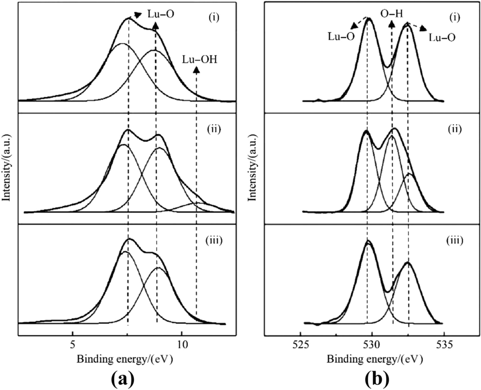 XPS spectra of the processed Lu2O3 surfaces, which correspond to a Lu 4f7/2, b O 1s ((i) before plasma treatment, (ii) after plasma treatment, (iii) after acid etching)