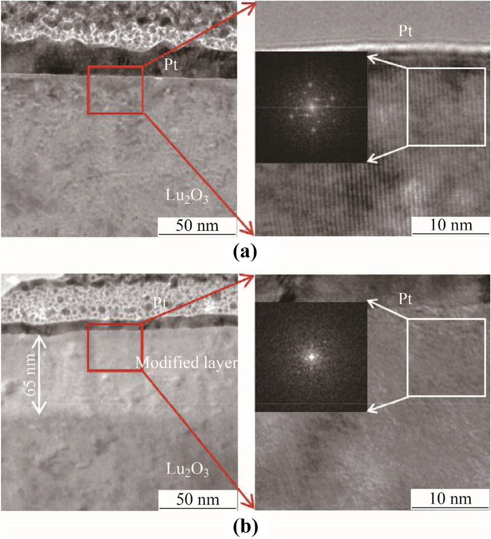 TEM is a very direct and clear way to observe subsurface changes. Figure 3 shows the TEM analysis of the Lu2O3 surface before and after irradiation by hydrogen plasma for 2 h, and the illustration is the fast Fourier transform (FFT) pattern for the white selected area [31‐33]. The modified layer was covered by a Pt layer to protect it during the focused ion beam fabrication process. As shown in the low-resolution TEM images in Figs. 3a and b, a modified layer with a thickness of approximately 65 nm was generated after the plasma treatment. In the high-resolution TEM images and FFT pattern in Fig. 3, the Lu2O3 crystals changed from a homogeneous lattice to a disordered lattice after the hydrogen plasma treatment.