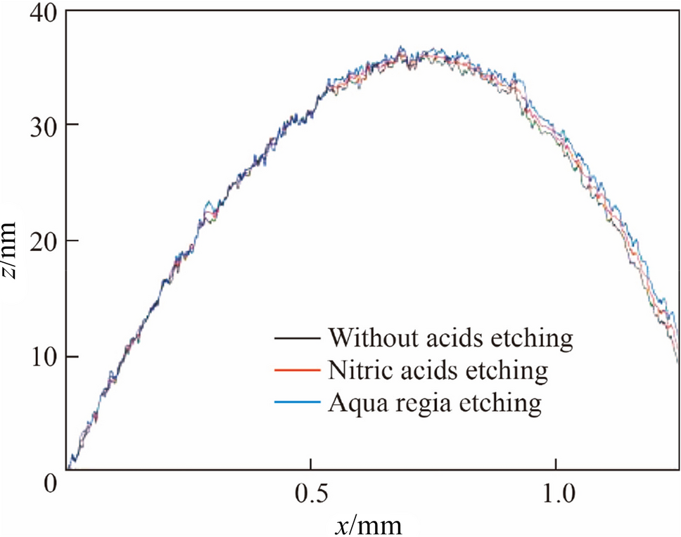 Lutetium oxide crystals have strong chemical inertia and extremely low reaction rates with acid. Figure 4 shows the two-dimensional (2-D) white light interferometry (WLI) image of morphological changes after the reaction of lutetium oxide with nitric acids or aqua regia for 1 h. The three 2-D contour curves are almost identical, which indicates that Lu2O3 hardly reacts with these two acids.