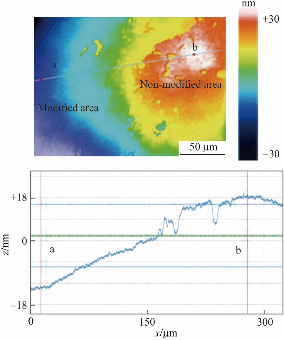Copper tape was used to cover half of the sample before plasma treatment to observe the removal effect after PaE. Then, the copper tape was removed and the modified Lu2O3 sample was etched with HNO3 to remove the modified layer. The etching results were obtained by comparing the surfaces before and after HNO3 etching, as shown in Figs. 5 and 6. A boundary between the modified area and the nonmodified area can be observed in Fig. 5. The gradual disappearance of scratches from the nonmodified area to the modified area indicates the effectiveness of the etching removal. The high-magnification SEM image in Fig. 5 shows that numerous scratches are exposed at the boundary. This could be the subsurface damage from previous processing which was exposed after PaE processing, and the scratches in the PaE processing area may have disappeared. Figure 6 shows a WLI image of the Lu2O3 sample, where the height of the modified area is lower than that of the nonmodified area by 25.7 nm. Moreover, increasing the acid etching time and changing the type of acid did not result in the removal of samples, proving the feasibility of PaE.
