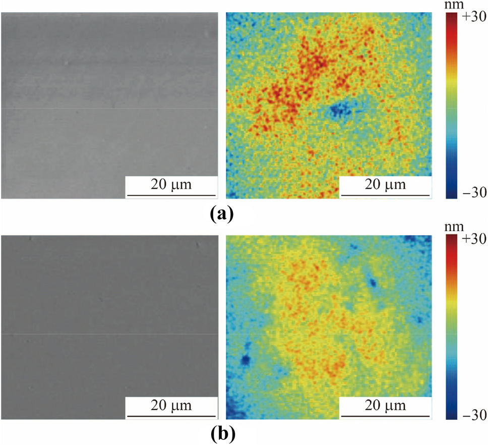 SEM and WLI images of Lu2O3 surface at the marked point a before PaE processing the arithmetical mean height of the surface (Sa) 0.40 nm, b after PaE processing Sa 0.38 nm