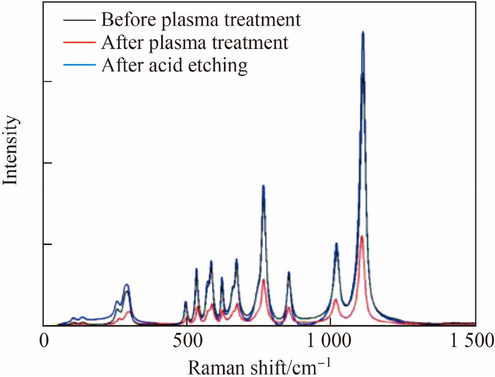 Raman spectroscopy is a nondestructive and efficient analysis method for characterizing subsurface damage [34]. This technique was used to characterize subsurface damage of marked areas before plasma treatment, after plasma treatment, and after acid etching; the results are shown in Fig. 9. The surface of Lu2O3 was modified with a layer of approximately 65 nm, as shown in Fig. 3c. In contrast, the Raman (532 nm laser) resolution depth was much higher than the layer thickness; the modified layer on the surface significantly affected the monocrystalline properties and the peaks decreased. The Raman peaks were higher after inorganic acid etching than before plasma treatment, indicating that the modified layer and the subsurface damages were both removed. Meanwhile, the disappearance of the XPS peak intensities of the Lu–OH bond after acid etching indicates that the modified layer can be removed easily, which means that an atomically flat Lu2O3 surface is obtained.