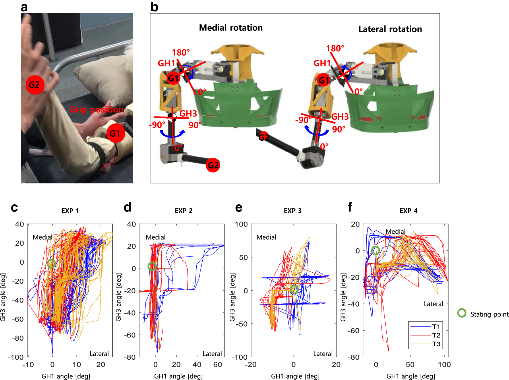 Figure 10 shows an example of expert data in an LM exercise. In the LM movement, experts typically hold the robot shoulders (G1) with left hand and the robot arm (G2) with right hand, as shown in Fig. 10a. The joints of G1 and GH2 were involved when performing LM motion while holding G1 and G2 as shown in Fig. 10b. In medial rotation, the GH2 joints were rotated inward and the GH1 joints were lowered, as the GH1 joint was raised while rotating the GH2 joint outward in lateral rotation. The results of the movement angle based on the joints of GH1 and GH2 are shown in Fig. 10c–f. In all three testing, although each expert showed a certain amplitude and period for each test, the angle pattern of all experts demonstrated a different movement.