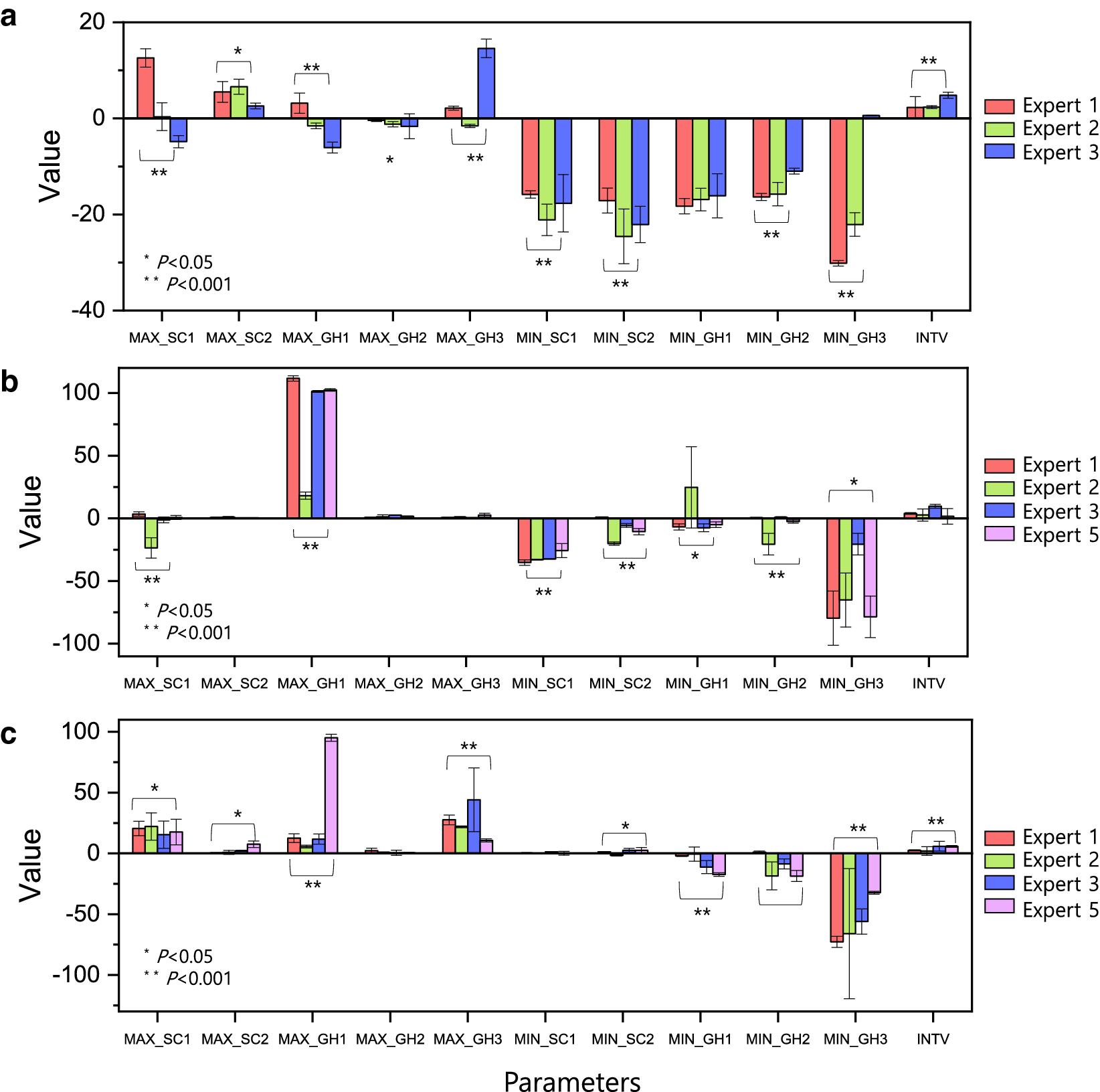 Figure 11 shows the results of the statistical analyses of ED, EF, and LM. To statistically evaluate the acquired data, we extracted all the eleven parameters: maximum angle of SC1 (MAX_SC1), maximum angle of SC2 (MAX_SC2), maximum angle of GH1 (MAX_GH1), maximum angle of GH2 (MAX_GH2), maximum angle of GH3 (MAX_GH3), minimum angle of SC1 (MIN_SC1), minimum angle of SC2 (MIN_SC2), minimum angle of GH1 (MIN_GH1), minimum angle of GH2 (MIN_GH2), minimum angle of GH3 (MIN_GH3), and the interval between consecutive cycles (INTV). Based on these parameters, an ANOVA test was conducted to analyze statistically significant differences between the experts. It was observed that all parameters except INTV (P = 0.138292) in the EF exercise exhibited significant differences between the experts.