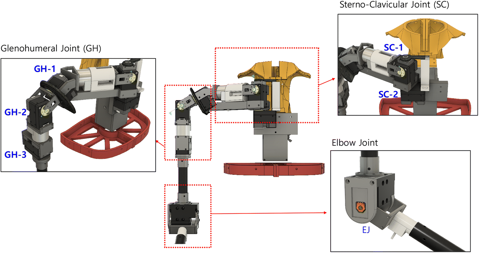 Here, we developed the robotic upper limb with glenohumeral (GH), sterno-clavicular (SC), and elbow joint (EJ) based on six degree of freedom (DOF). As shown in Fig. 1, the robotic joints of GH and SC were combined into the shoulder complex robot. The flexion–extension, abduction–adduction, and lateral-medial rotation of the GH joint were reproduced by combining three servomotors, while elevation–depression and the horizontal extension-horizontal flexion of the SC joint were reproduced by combining two servomotors. The flexion–extension of the EJ was reproduced by one servomotor. The symptoms were reproduced by the torque control and the angles of six servo motors.