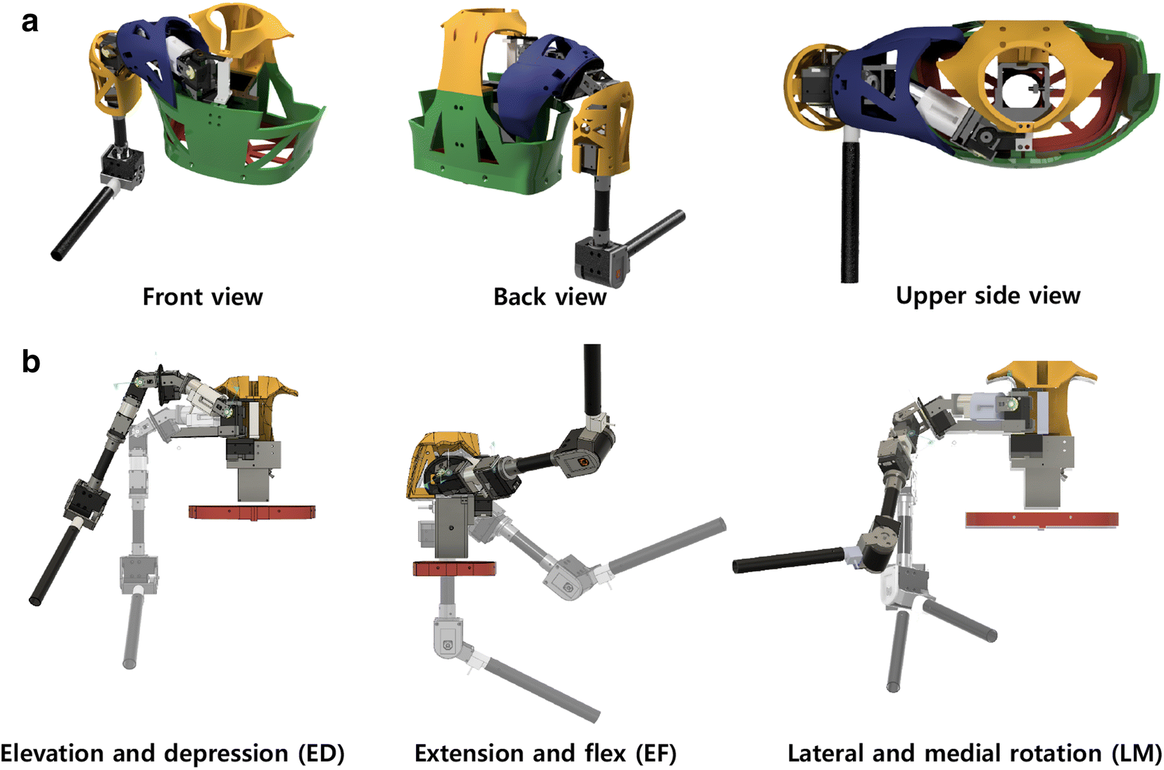 Upper limb of the care training assistant robot. a 3D modeling views. b Mechanisms of the upper limb of care training assistant robot