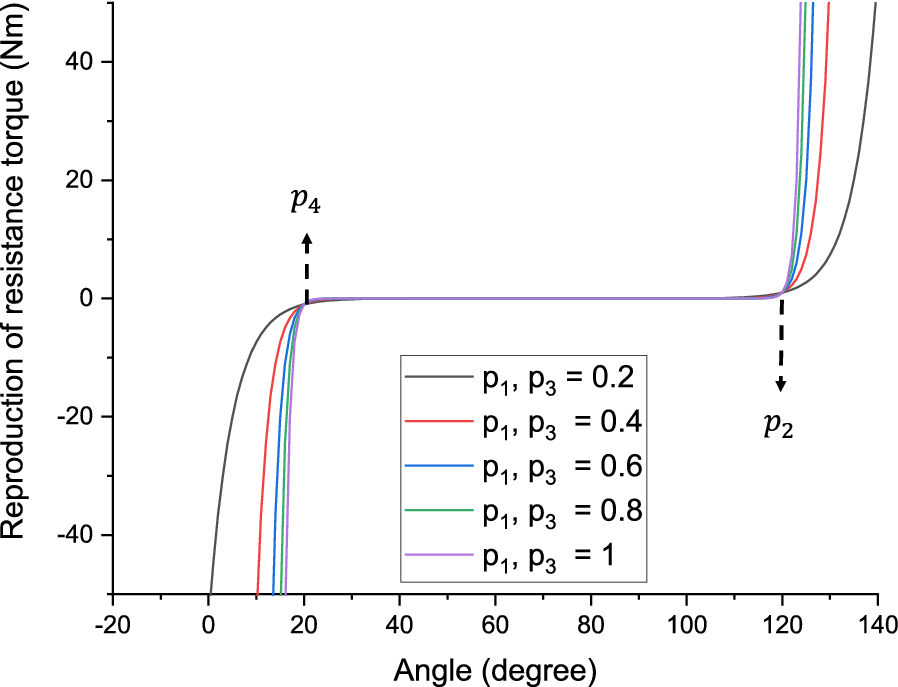 To mimic the human joints, Yamazaki et al. [27] proposed the Eq. (1) of resistance torque by fitting four parameters as p1, p2, p3, and p4.