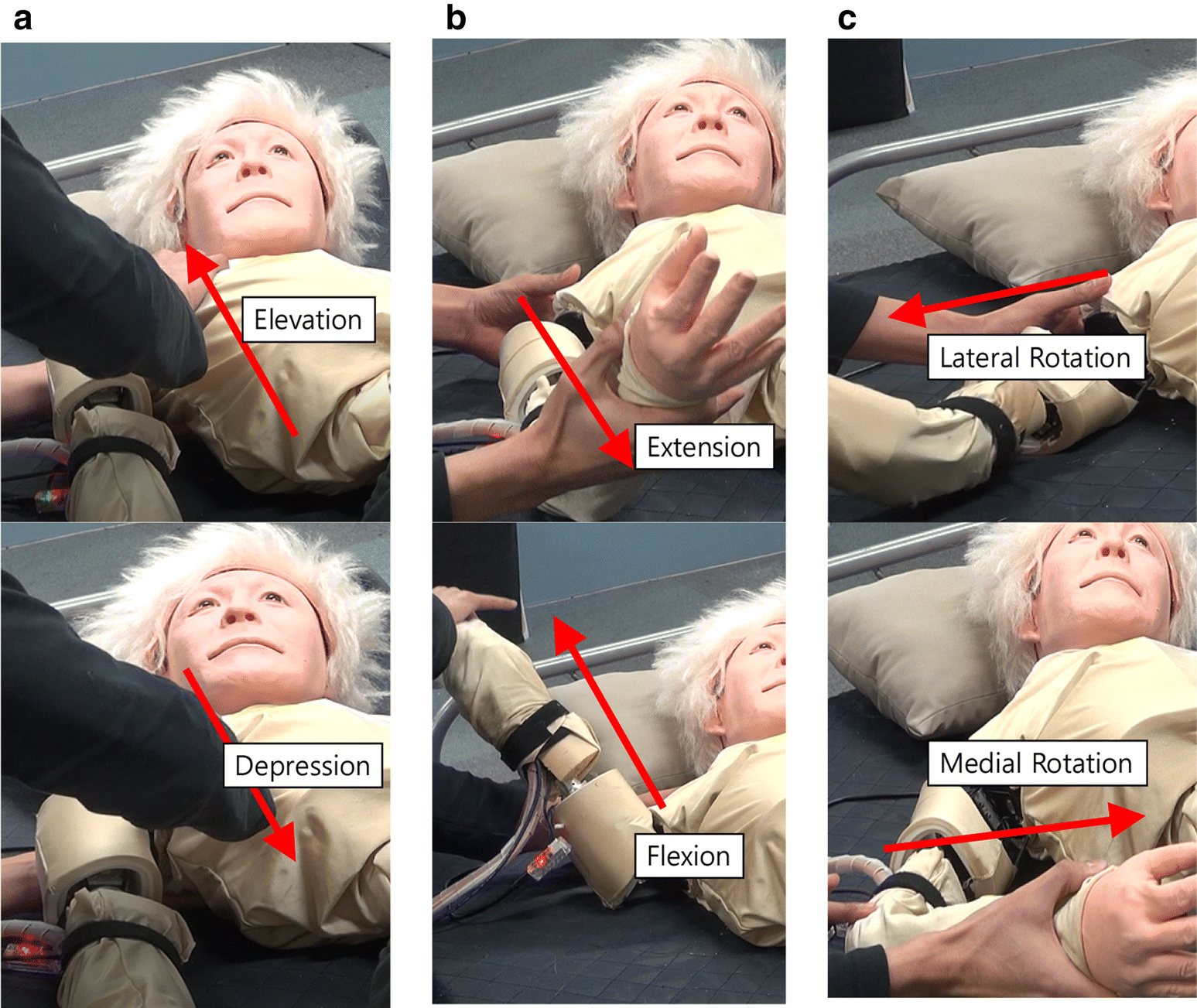 Typical example of the motion range (ROM) exercise. a Elevation–depression; b extension-flexion; c lateral rotation-medial rotation