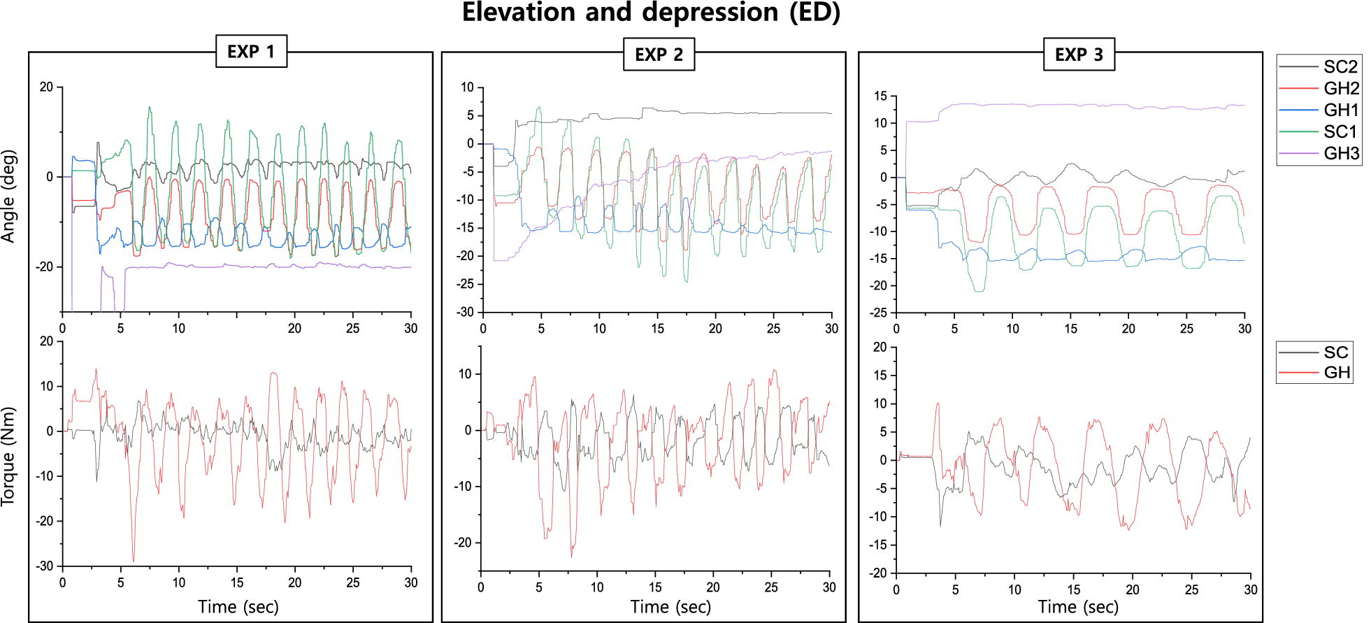 Experiment values of the raw data of angle and torque in elevation and depression (ED) exercise from the experts (EXP expert, SC sterno-clavicular joint, GH glenohumeral joint). The x-axis indicates the time (unit: second). The top and bottom y-axes represent the angle (unit: degree) and torque (unit: Nm), respectively