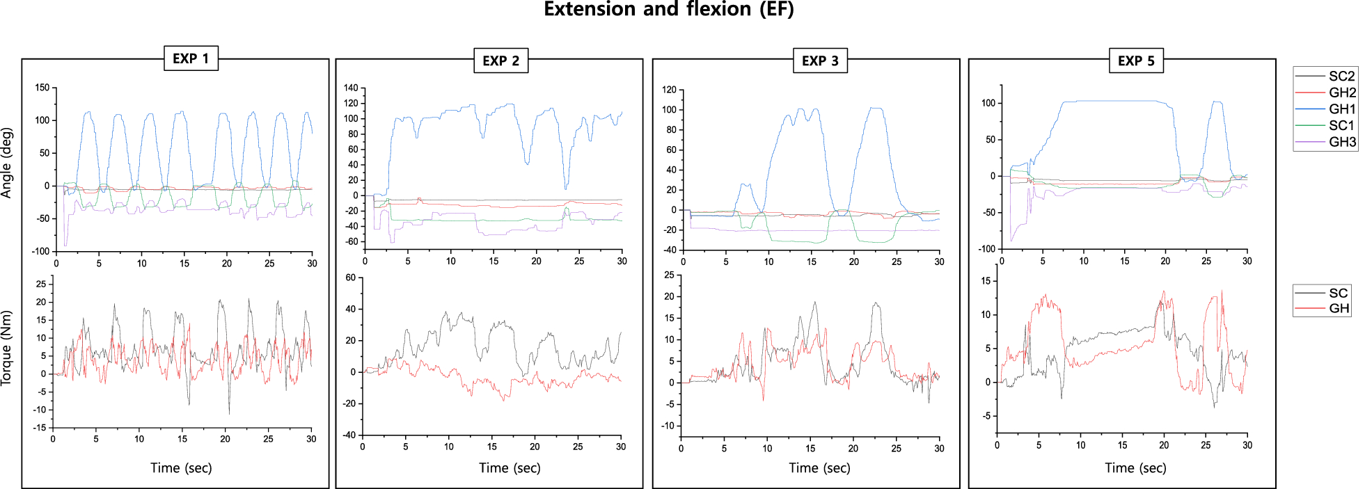 Experiment values of the raw data of angle and torque in extension and flexion (EF) exercise from experts (EXP expert, SC sterno-clavicular joint, GH glenohumeral joint). The x-axis indicates the time (unit: second). The top and bottom y-axes represent the angle (unit: degree) and torque (unit: Nm), respectively