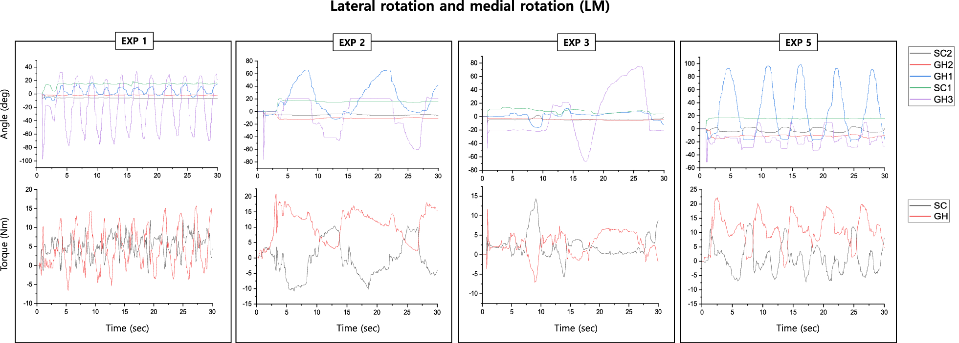 Experiment values of the raw data of angle and torque in lateral and medial rotation (LM) exercise from the experts (EXP expert, SC sterno-clavicular joint, GH glenohumeral joint). The x-axis indicates the time (unit: second). The top and bottom y-axes represent the angle (unit: degree) and torque (unit: Nm), respectively