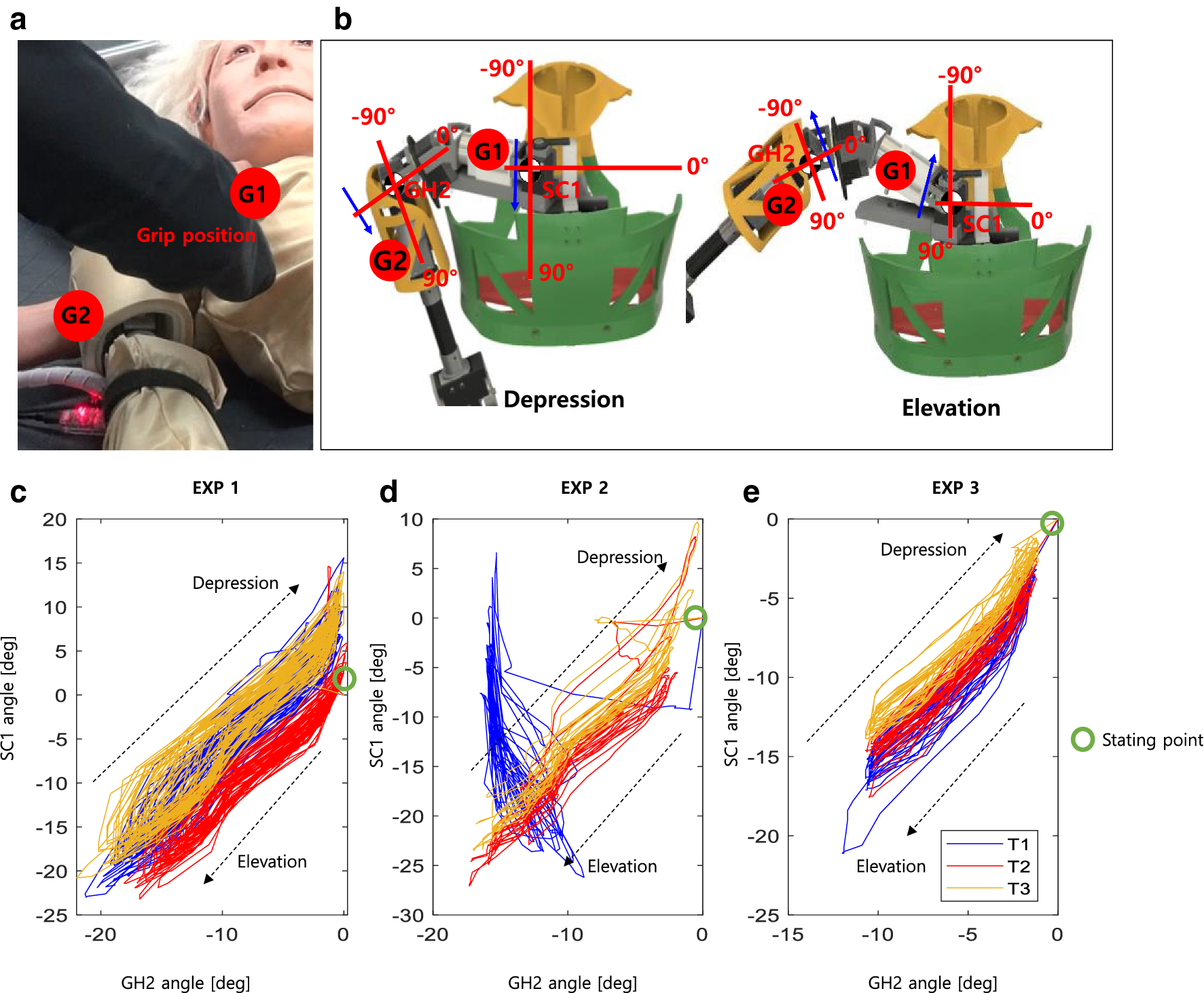Figure 8 shows the example of angle curves between SC1 and GH2 during the ED exercise performance by experts. Typically, the experts hold the robot shoulder (grip position 1: G1) with their right hand, and the arm (G2) with their left hand when performing the ED exercise as shown in Fig. 8a. Figure 8b presents the mechanism of the ED exercise, while the joints of SC1 and GH2 were involved when performing ED movement with robot based on G1 and G2. In the depression movement, the expert lowers the SC1 joint of the robot while lowering the GH2 joint simultaneously, and vice versa. Figure 9c–e shows the angle curves of SC1 and GH2 joints. In all three tests (T1, T2, and T3), EXP 1 (Fig. 8c) and EXP 3 (Fig. 8e) had a constant angle amplitude and movement period for each test. However, the EXP 2 showed that the T1 movement was in the opposite direction of T2 and T3 (Fig. 8d). EXP 2 lowered the shoulder joint (GH2) when raising the clavicle (SC1) during the first test (T1), and raised it when lowering the clavicle joint.
