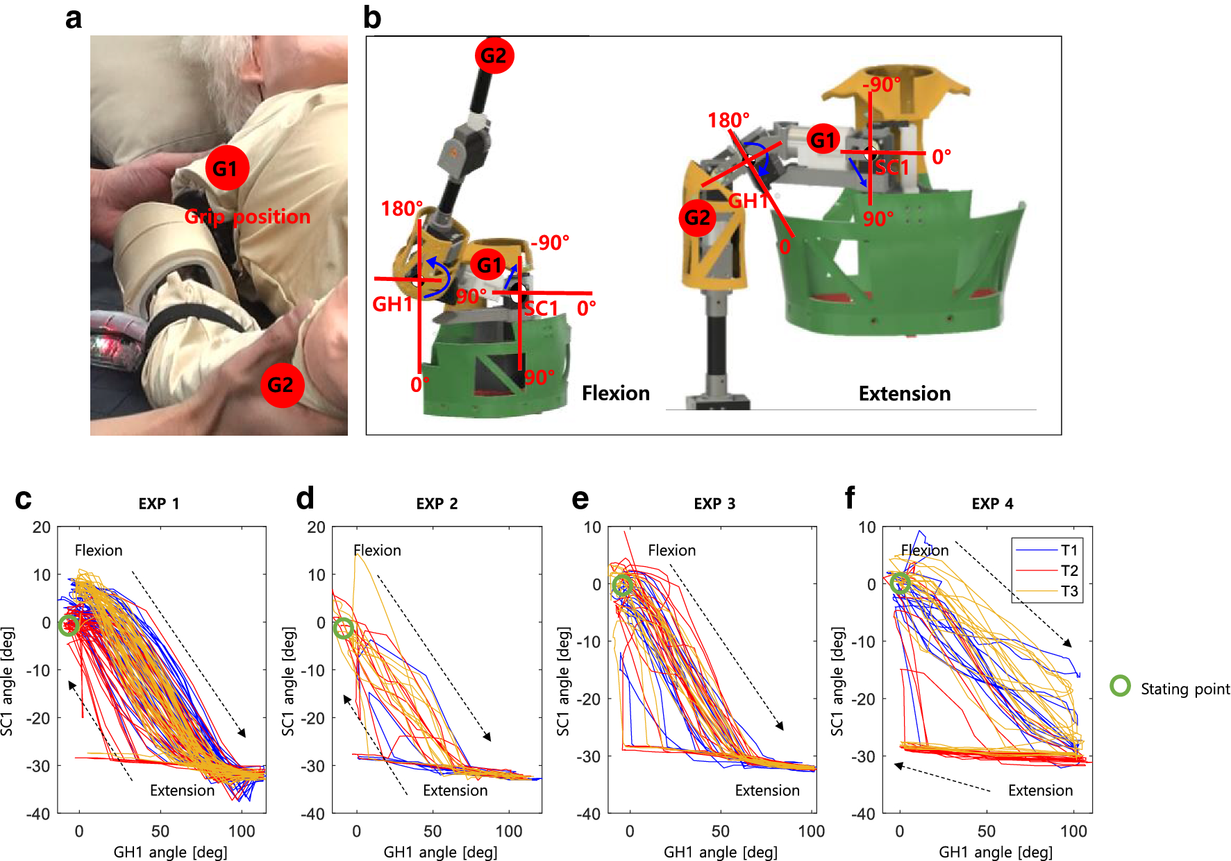 Figure 9 shows the examples of angle curves between SC1 and GH1 during the EF exercise performance by the experts. When performing the EF exercise, the experts generally tend to hold the robot shoulders (G1) with their left hand, and the arm (G2) with their right hand, as shown in Fig. 9a. Then, the joints of SC1 and GH1 were involved when performing EF movement with G1 and G2, as shown in Fig. 9b. In the flexion movement, the GH1 and the SC1 joints were raised simultaneously, and vice versa. Figure 9c–e shows the angle curves of SC1 and GH1 joints. EXP 1, EXP 2, and EXP 3 had the constant amplitude of angle range and the movement period for each test. In the result of EXP 4, the subject did not bend the robot joints as much as possible when the angle changed from extension to bend, and moved only about − 10 to 10 degrees, thus, exhibiting a difference from the results of other experts.
