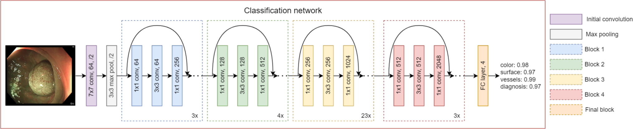 The objective is to classify the texture, colour, and vessel features of a polyp according to the NICE classification using a deep neural network based on ResNet [22]. The third category of the NICE classification pertains to deep submucosal invasive cancer, which is rare and relatively straightforward for doctors to classify. Due to limited data, this study focuses on the first two categories: adenoma and hyperplastic polyps. This creates a multiclass problem with two labels for each feature category. The diagnosis is also predicted during the training process, as the label is already available and provides additional valuable information to enhance the model’s learning and overall accuracy. The model employed is a ResNet-101, pretrained on ImageNet, with four classes, as depicted in Fig. 1.