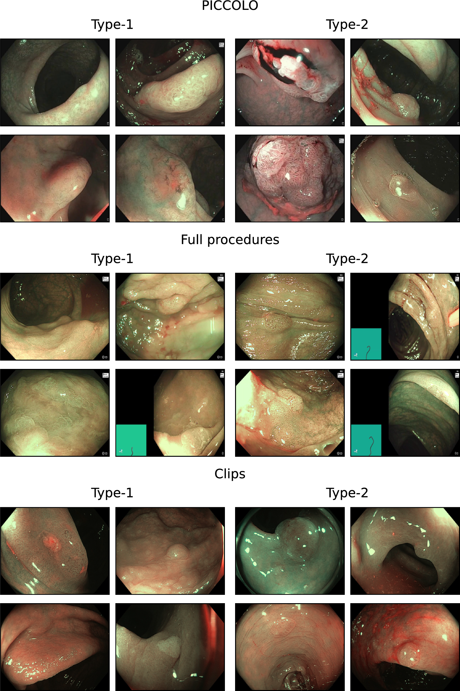 Examples of images from each dataset, with type-1 polyps on the left and type-2 polyps on the right. Some polyps can be challenging to locate. All annotated frames provide a clear view of the polyp and utilize the NBI modality to ensure diagnostic accuracy