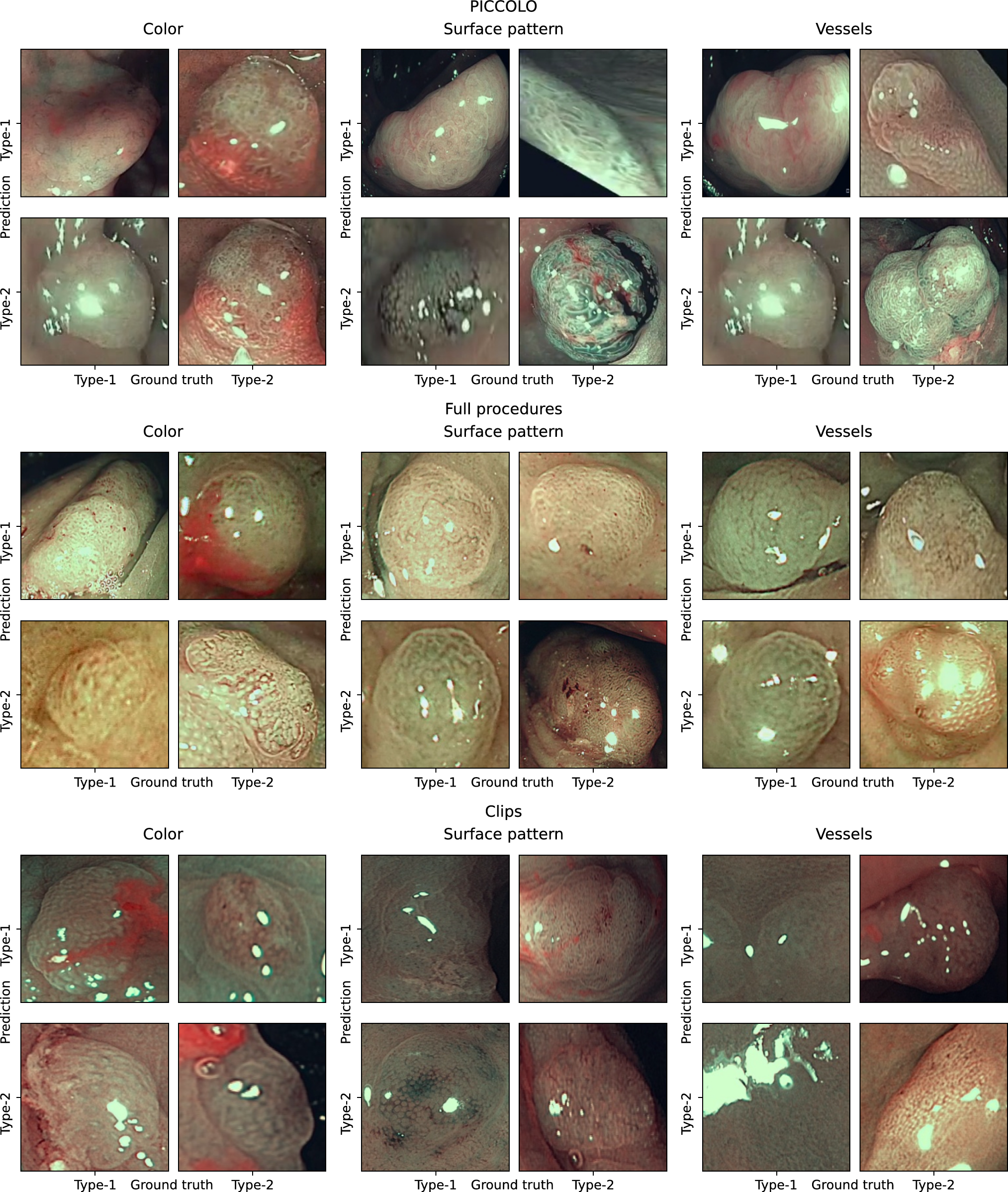 The classifier successfully classified the three polyp features, achieving an accuracy of over 92% on internal datasets and exceeding 88% on a public dataset. The high classification accuracy demonstrates the system’s effectiveness in identifying the key features from the NICE classification.