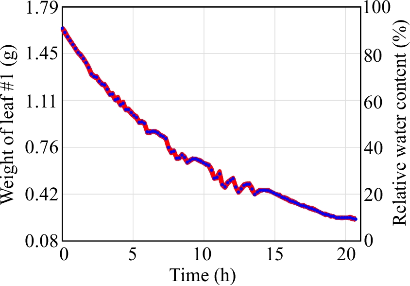 Figure 2 shows leaf 1 recorded weight variations over time, reflecting the dynamics of water diffusion from the leaf tissues and the resulting changes in hydration states. In accordance with the recorded leaf weights at different hydration states, their corresponding relative water contents can be characterized using [28]