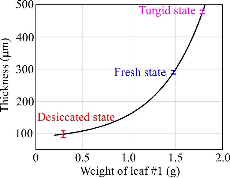 To accurately extract the complex permittivities of leaf 1 in various hydration states, it is essential to determine the corresponding thicknesses. Directly measuring the leaf’s thickness regularly can shift the leaf out of the focal plane of terahertz waves, leading to inaccuracies in measured transmission coefficients. Additionally, multiple measurements with applied pressure to the leaf may artificially alter its thickness. Alternatively, the leaf thickness variations can be estimated based on a relationship between the leaf weight and thickness shown in Fig. 3. It is noted that such a weight-thickness relationship is used only for establishing accurate correlations among the leaf complex permittivity, relative water content, and water potential. Leaf weight measurement is not required for field applications. The exponential relationship [11] between them can be explained by the varying rate of water evaporation in different hydration states. In the leaf turgid state, a high rate of water evaporation leads to cell collapse and thus a significant decrease in its thickness. However, as the leaf continues to lose water, the remaining moisture becomes tightly bound within the leaf cell walls and intracellular spaces [31], resulting in a less pronounced reduction in thickness. Accordingly, the leaf thickness at a specific hydration state can be mapped from its corresponding weight using Fig. 3.