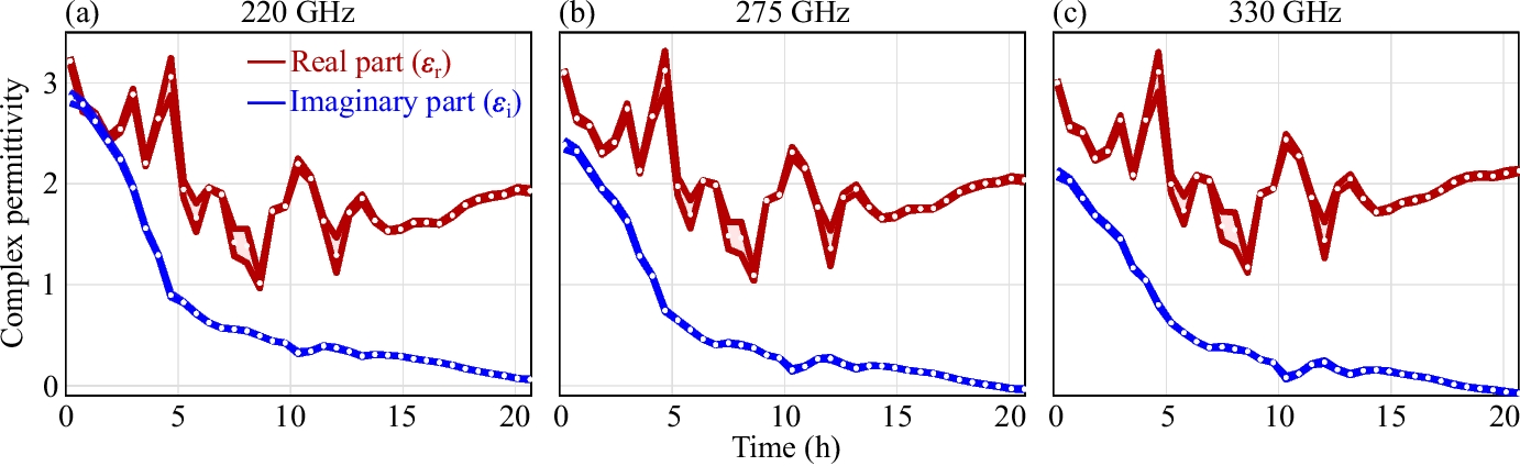 Measured complex permittivity against time at a 220, b 275, and c 330 GHz. White dots represent mean values, and colour stripes denote one standard deviation