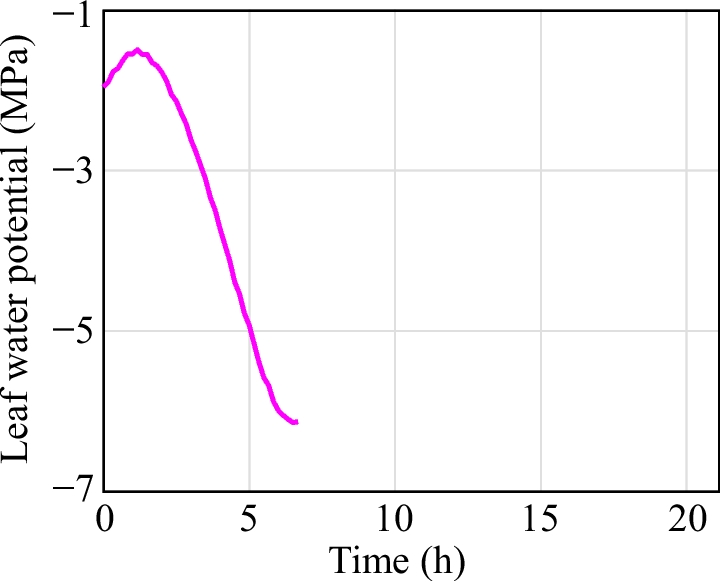 Measured leaf water potential variations over time. Due to the measurement limit of the psychrometer instrument, leaf water potential below \(-6.1\) MPa cannot be measured