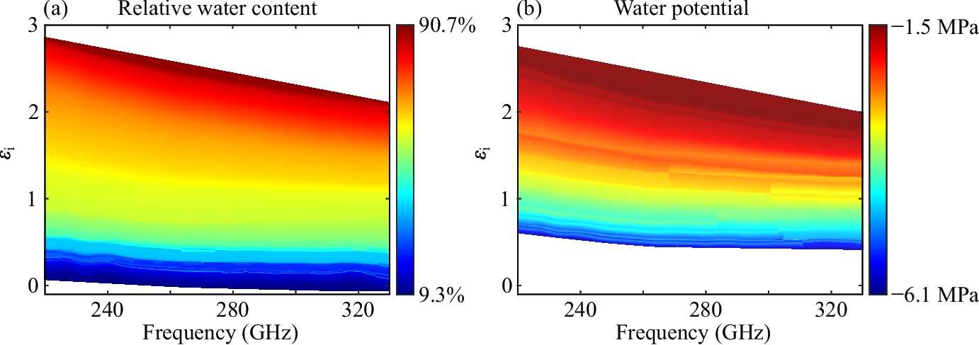 Based on the synchronized measurements on the leaf relative water content, complex permittivity, and water potential across different hydration states, direct correlations between them can be established as shown in Fig. 6. As such, both the leaf water potential and relative water content can be readily evaluated from the permittivity extracted using terahertz waves at any single frequencies between 220 and 330 GHz. The established correlations enable real-time plant water status monitoring for field applications.