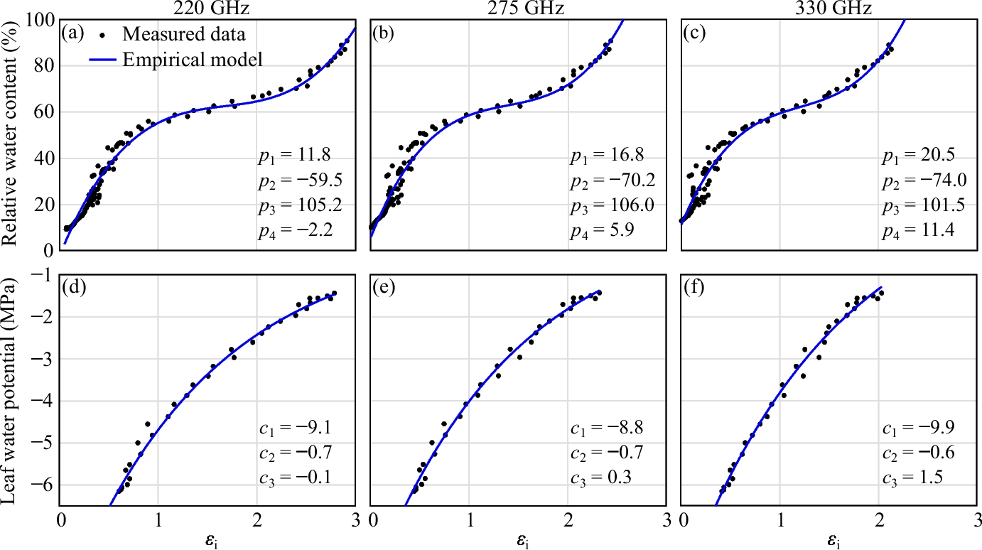 Empirical models for evaluating leaf relative water content at a 220, b 275, and c 330 GHz, and for estimating water potential at d 220, e 275, and f 330 GHz. The empirical model for the relative water content evaluation can be expressed as \(\text {RWC} = p_\text {1}\epsilon _\text {i}^{3} + p_\text {2}\epsilon _\text {i}^{2} + p_\text {3}\epsilon _\text {i} + p_\text {4}\). The empirical model for the water potential estimation is \(\Psi _\text {leaf} = c_\text {1}e^{c_\text {2}\epsilon _\text {i}}+c_\text {3}\). The corresponding coefficients are provided in a–f and are obtained using curve fitting