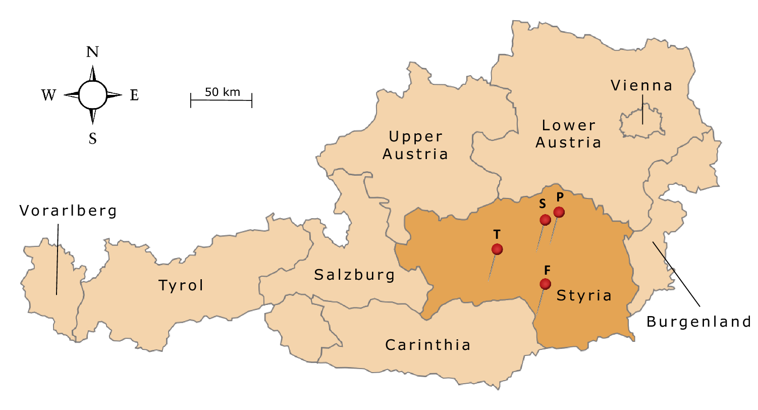 Location of wind farms targeted in the survey (T = Tauernwindpark, S = Steinriegel, P = Pretul, F = Freiländeralm; all parks are located in the federal state of Styria). A detailed map of wind power plant sites in Austria is provided by the Austrian Wind Energy Association. URL: www.igwindkraft.at/landkarte/ (accessed April 25, 2019, in German)