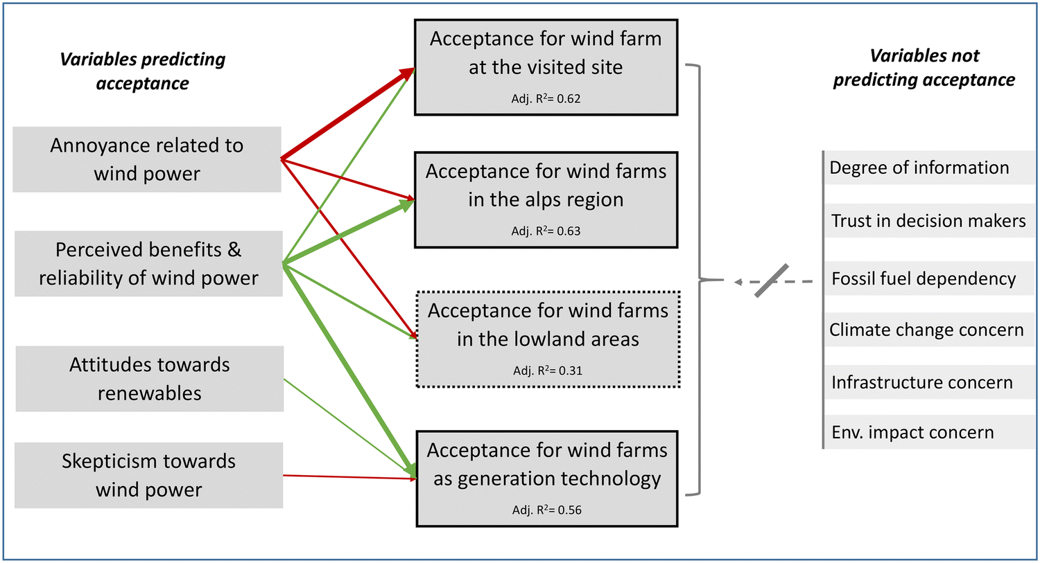The main predictor for acceptance is the perceived benefits of the project, while annoyance level is the main predictor for non-acceptance. The conclusions of Rand and Hoen (2017) in their review for studies from North America thus also hold for the sample of visitors in the Austrian Alps. Concern regarding environmental impacts is mainly relevant for projects in the Alps, but less relevant for projects in the lowlands, or the technology in general. Alpine environments obviously matter to their visitors, and those who are concerned about impact stemming from such projects tend to be less welcoming to them. Other variables play a minor role, or no role at all in explaining acceptance or non-acceptance. For example, climate change concern is high in the sample, but not related to acceptance at all, and attitudes toward renewables only predict acceptance for the technology, but not acceptance for projects in the mountains or in the lowlands.