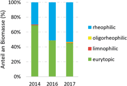 Entwicklung der Strömungsgildenanteile an der Gesamtbiomasse in den Jahren 2014, 2016 und 2017